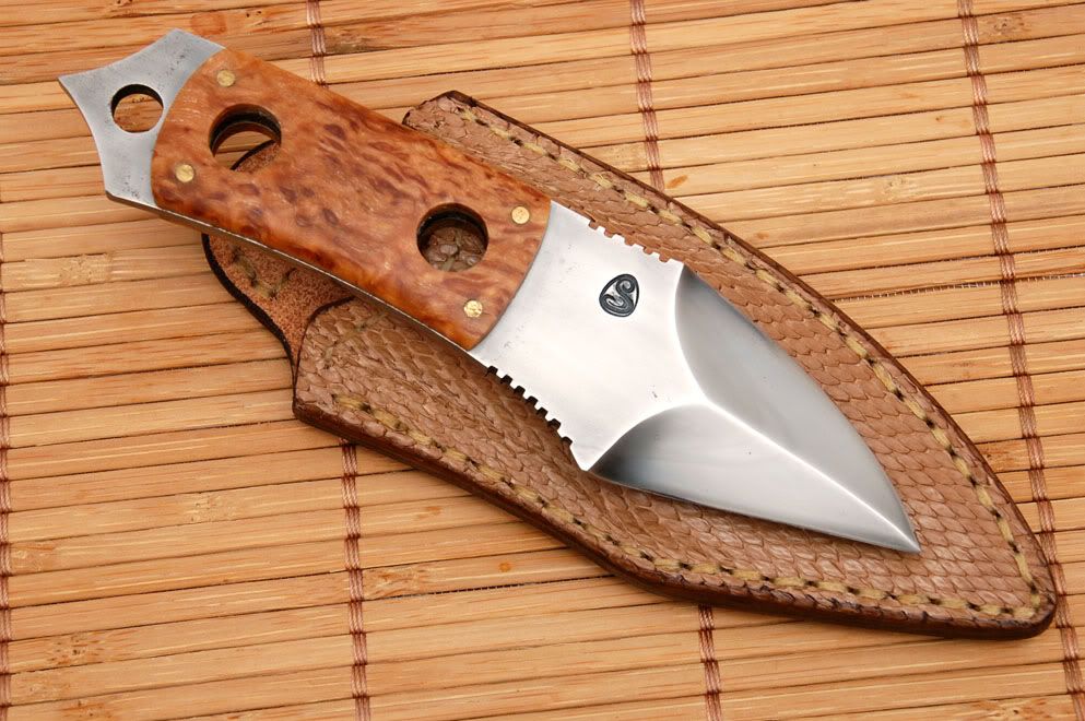 Made by the french maker Jean Paul Sire, it's basicly a kiridashi with a 2" double edged blade. Don't know what the steel and wood are.