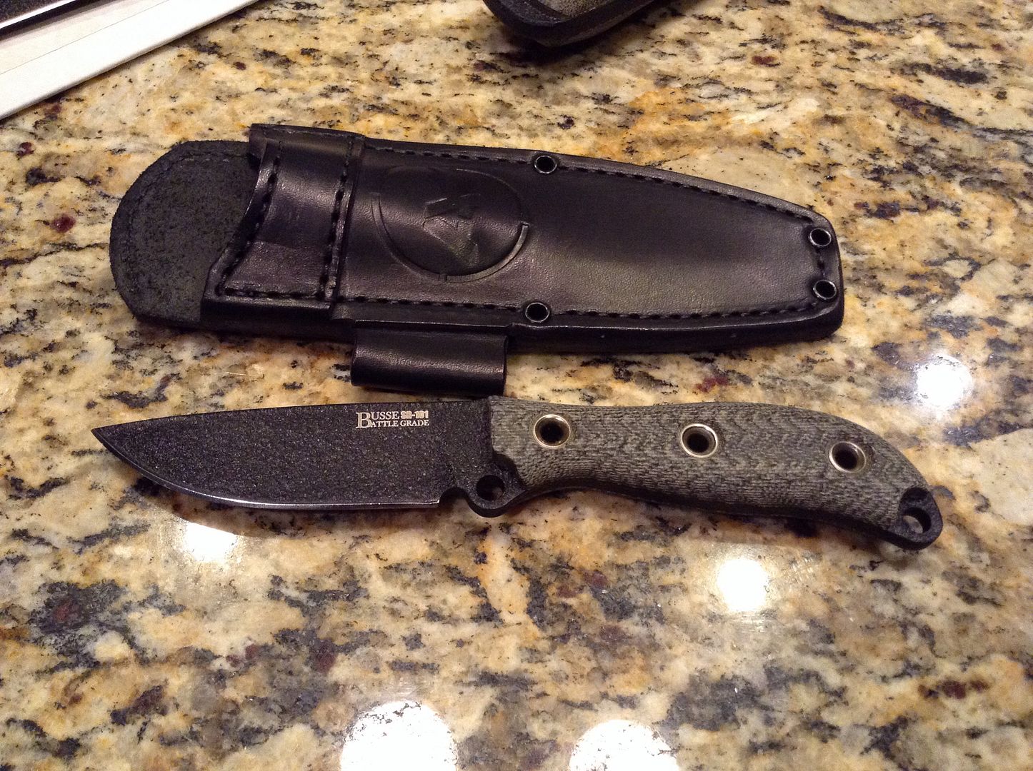 Last I have a new, unused Busse Battle Grade Active Duty. Black w/ black Micarta with a beautifully fitting and very nice leather sheath. ---Sold---