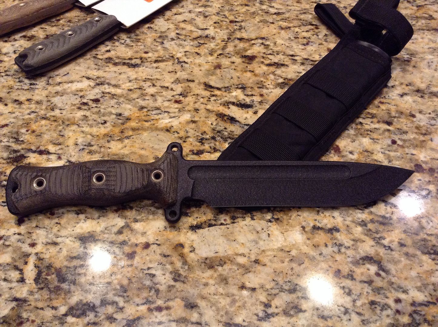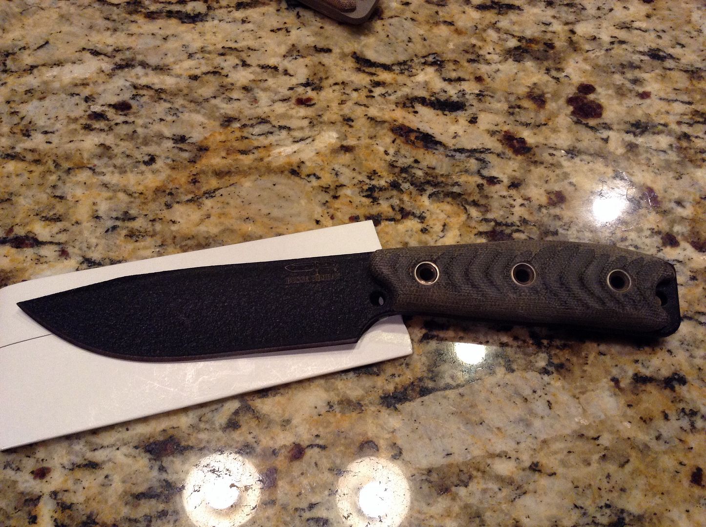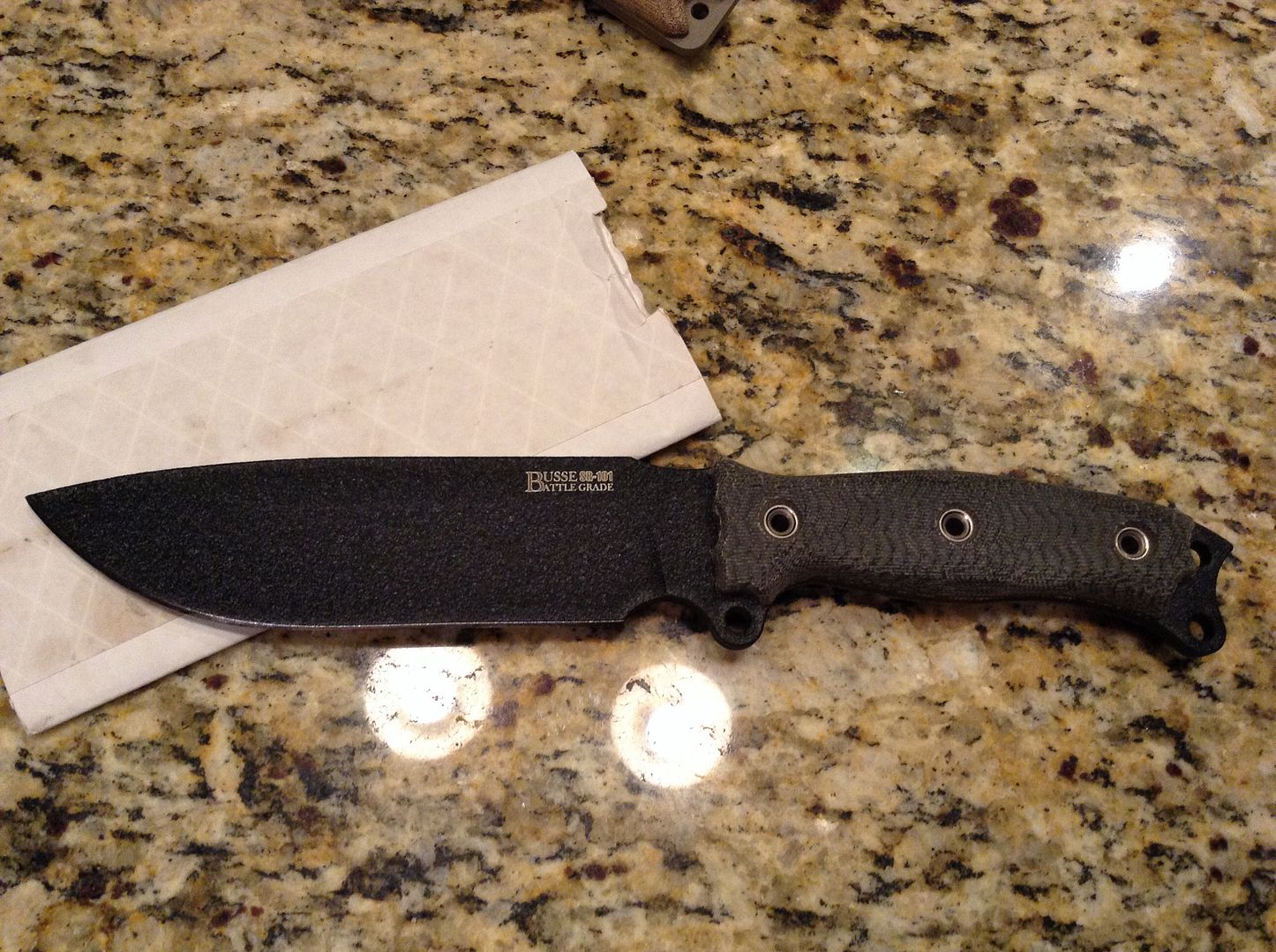 Next I have a Busse TGLB. Black with black Micarta. Includes the Spec Ops sheath. This one has been handled but has never cut a thing. Price is $500 ---Sold---