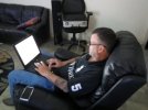 Here's a pic of Mike at my house for a visit, even then he is still working. He had a fresh idea for the blade and pulled out the laptop and whipped up the file on the spot. I am proud to call Mike a best friend, his passion for knives is only increasing as the years go by.