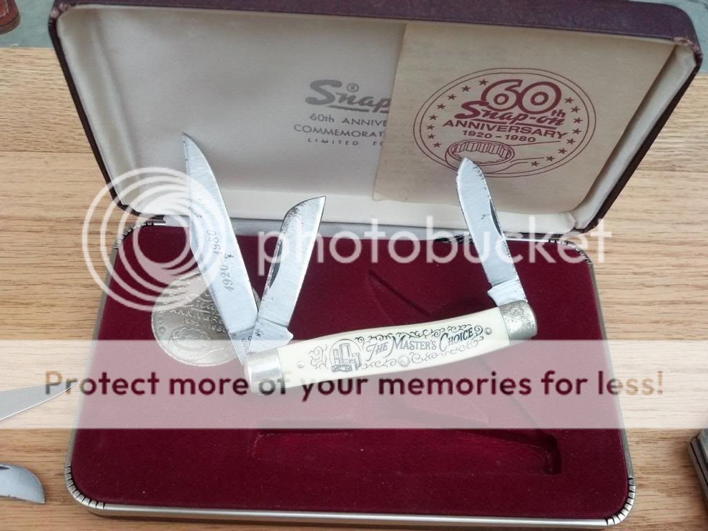Schrade USA Snap-On 60th Anniversary - This knife was made in 1980 to commemorate Snap-On’s 60th Anniversary (duh, huh?). 4” stockman with ivory delrin handles. Front side is scrimshawed for the 60th Anniversary, rear side has image of tools and “The Master’s Choice”. Blade is etched “Snap-on 60th Anniversary, Limited Edition 1 of 20,000”. Tang stamp on mark side says “LIMITED EDITION”, Pile side tang stamped “S.C.C. / OSO-1/ U.S.A.” Bolster has serial number E01582 stamped on it. Some peper spotting on backsprings and all 3 blades, and bolsters, but otherwise unused. Comes in a Snap-On commemorative case with commemorative papers. Also has German Silver commemorative coin. Case is in good shape with a few scuffs on the corners. With a little proper cleaning, this will be a beautiful knife for your collection. Asking $60 TYD.