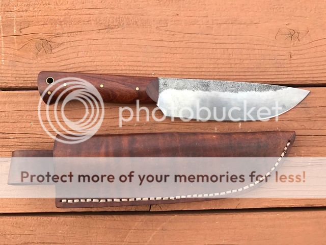 A beefy knife that I used as my kitchen knife for a couple years. Ironwood handle and a six inch plus blade. Leather sheath that has seen the outdoors. Patina on blade. A little flitz and will clean right up. $200