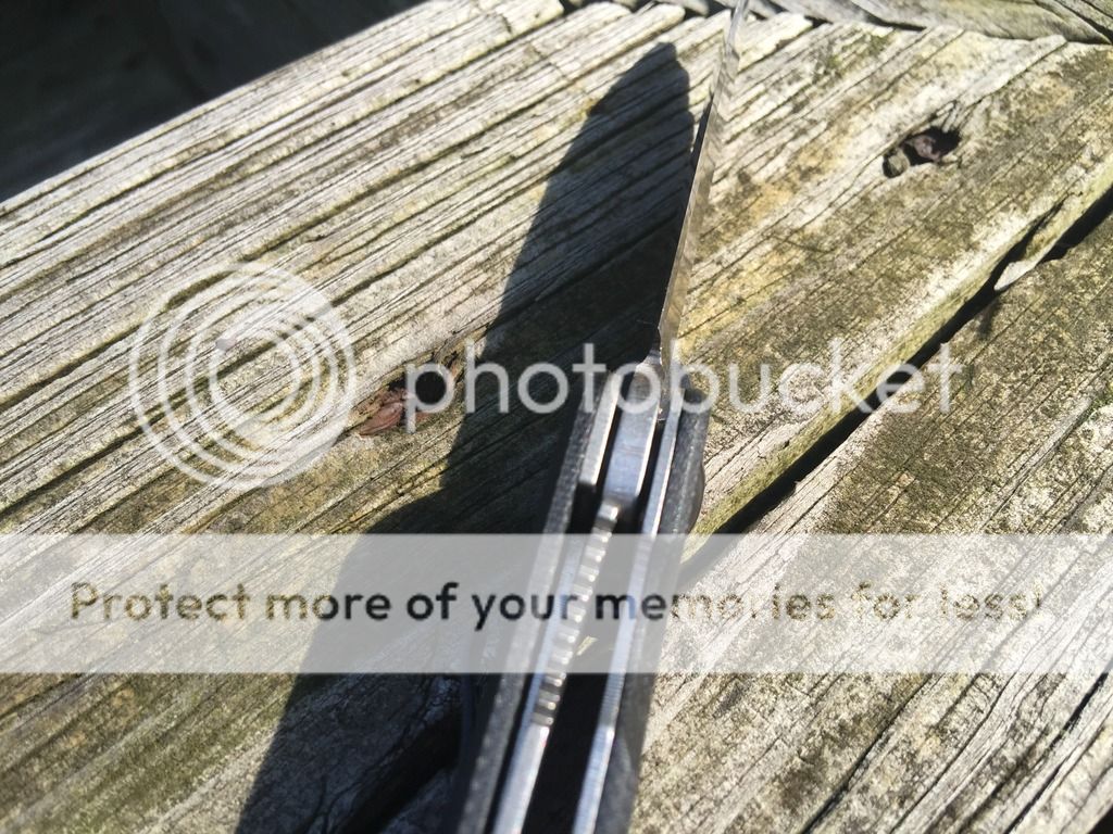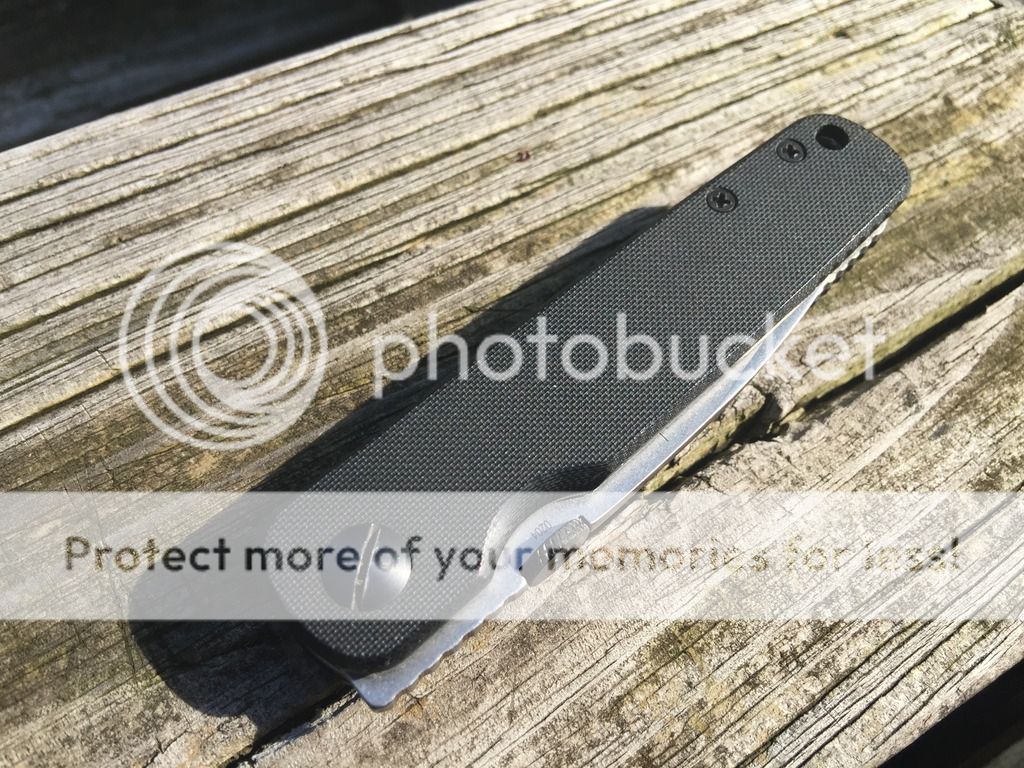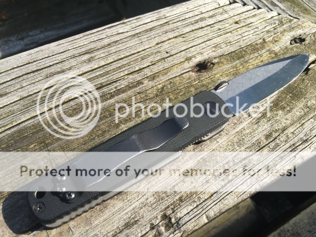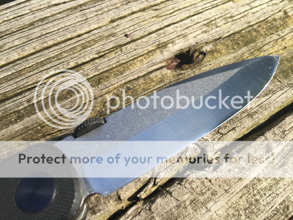 I am the original owner of this knife and it has been carried and used. The edge has been re-profiled on my wickededge. It is not a perfect re-profile, but I think it came out pretty good for one of my first times re-profiling. The knife is smooth, the blade is centered, and the lock up is solid. There are scratches on the sides and tip of the blade from use and the pocket clip is scratched (see photos). This is for the knife only, no box.