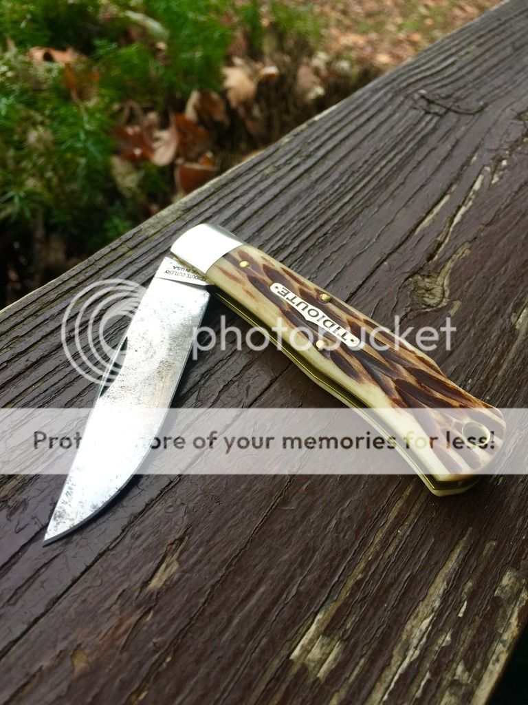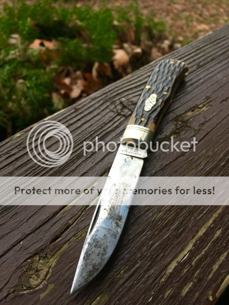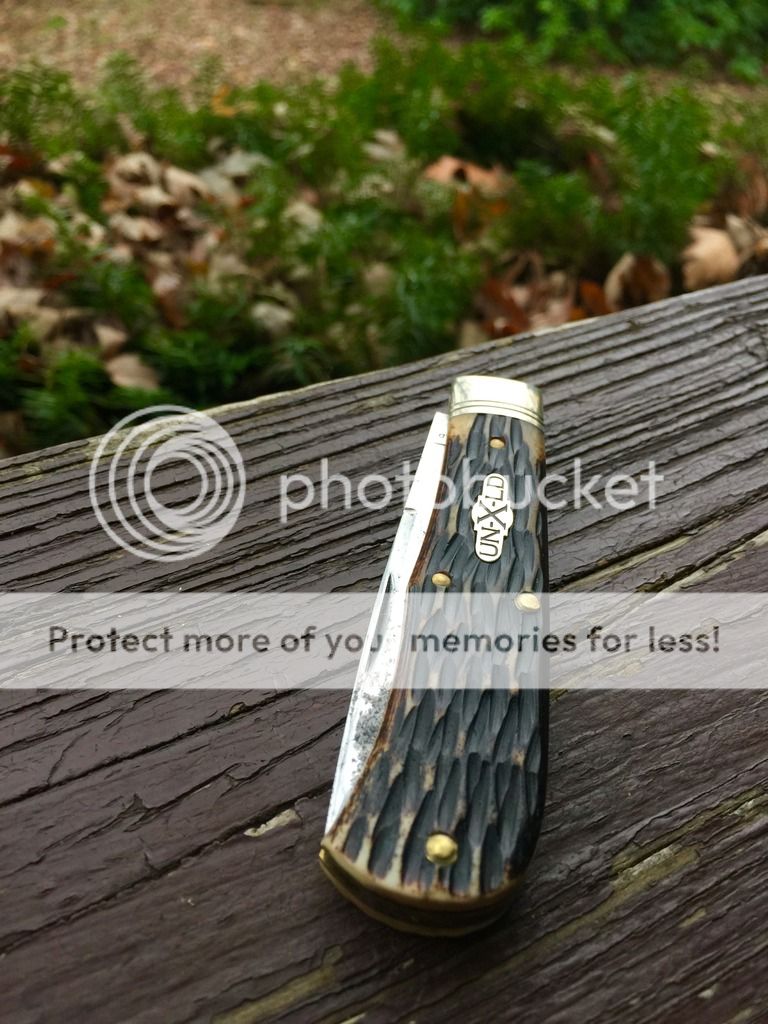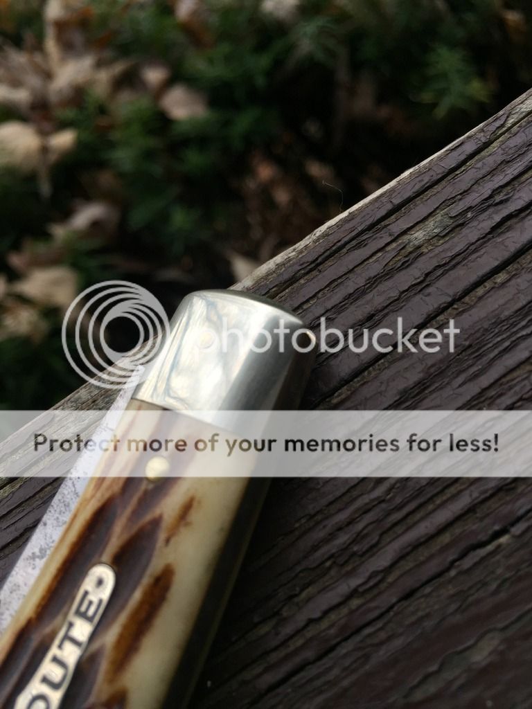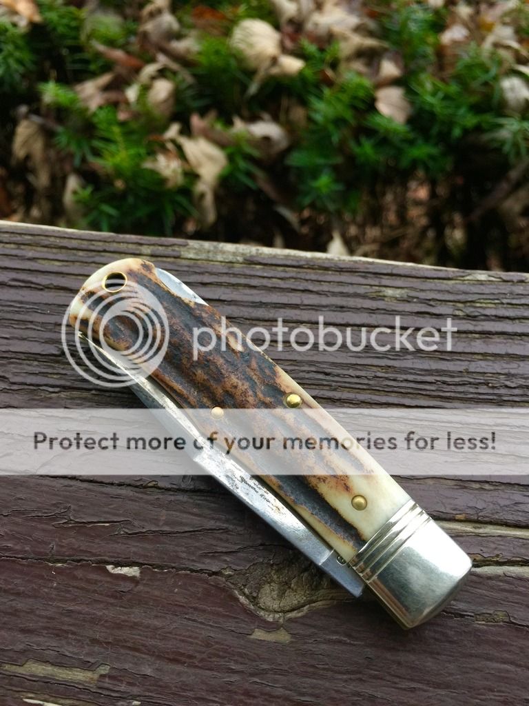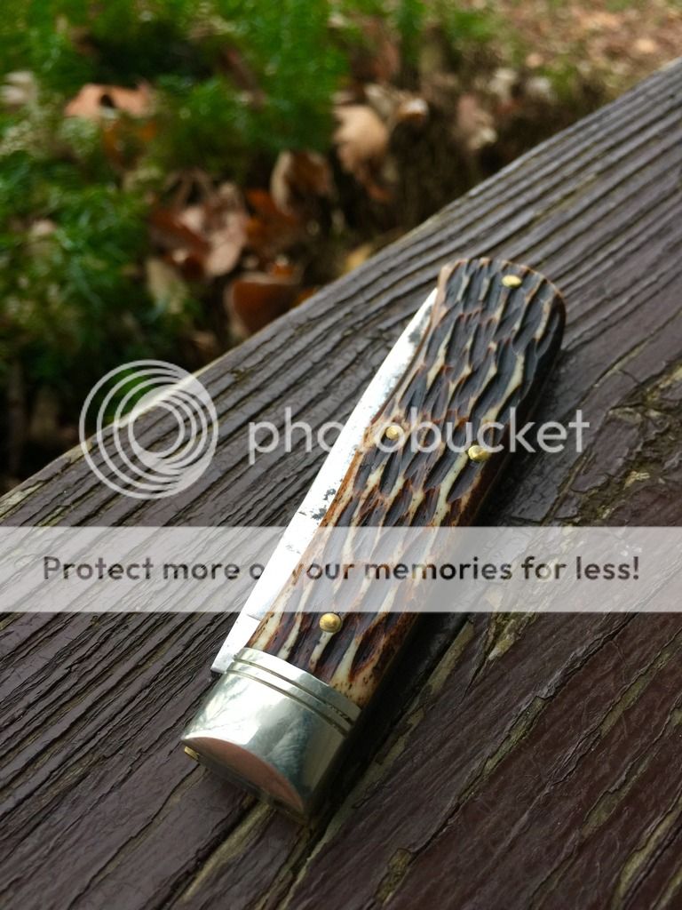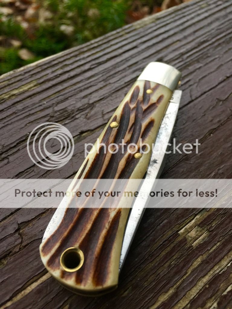 I forget the name of the jigged bone, but it's black. Knife has been used, carried and sharpened. No play on this one and a stout backspring.