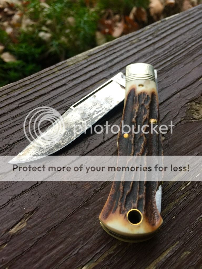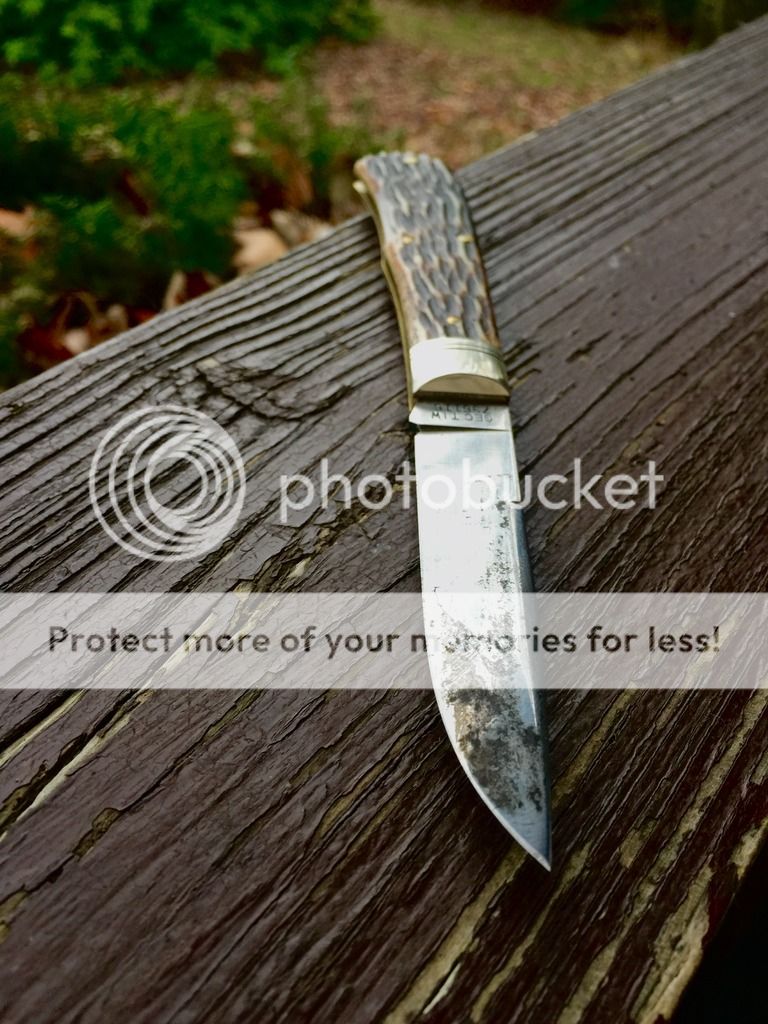 Very slight play on this one. Has some nice patina on the blade and some great stag. All around an awesome user!