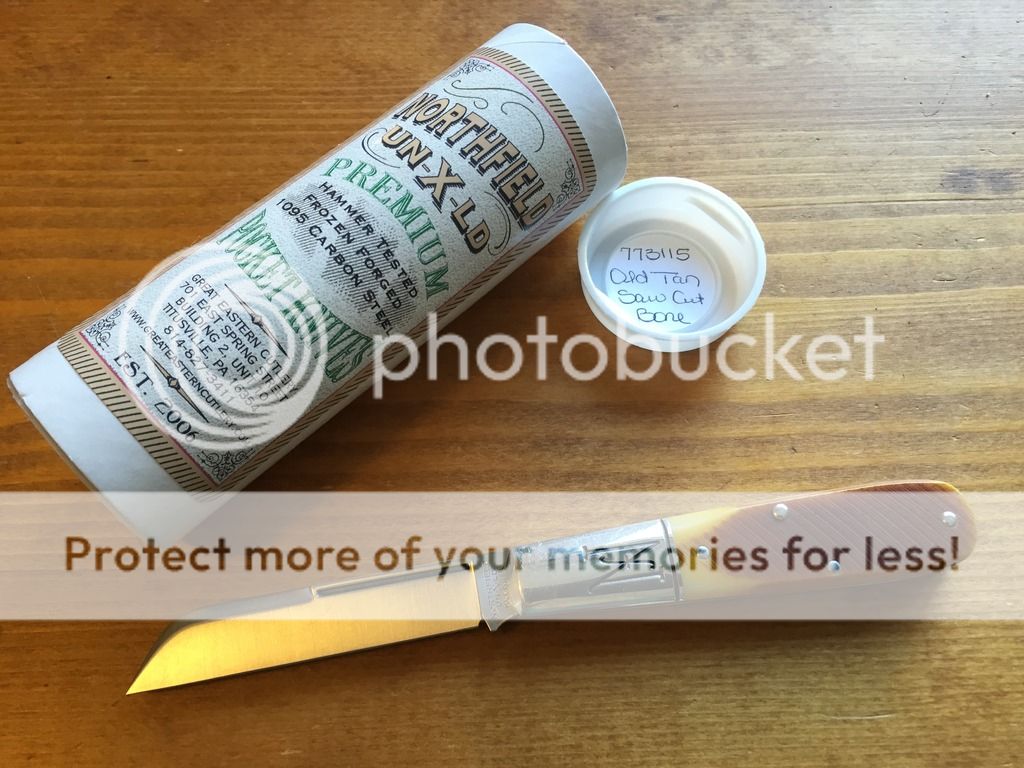3) #77 Old Tan Saw Cut Bone. Faint scratches on blade and bolster.