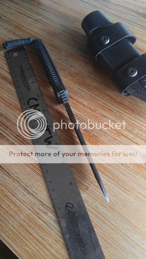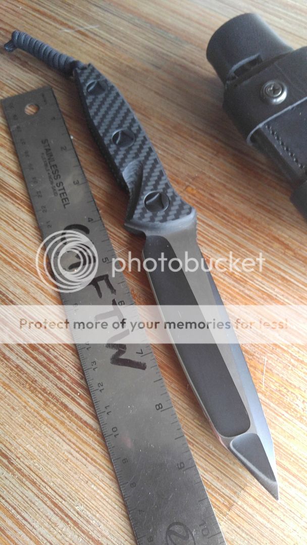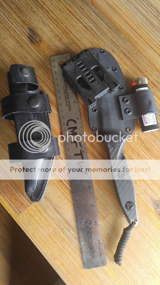 As I'm delving further into fixed blades, I've learned that a 5" blade just isn't long enough to hit my knife g-spot so I'm selling this for half what I paid. It has some light scratches and has been sharpened. Comes with original leather sheath and a custom kydex "CM carry Urban Survivalist" rig. Lighter included.