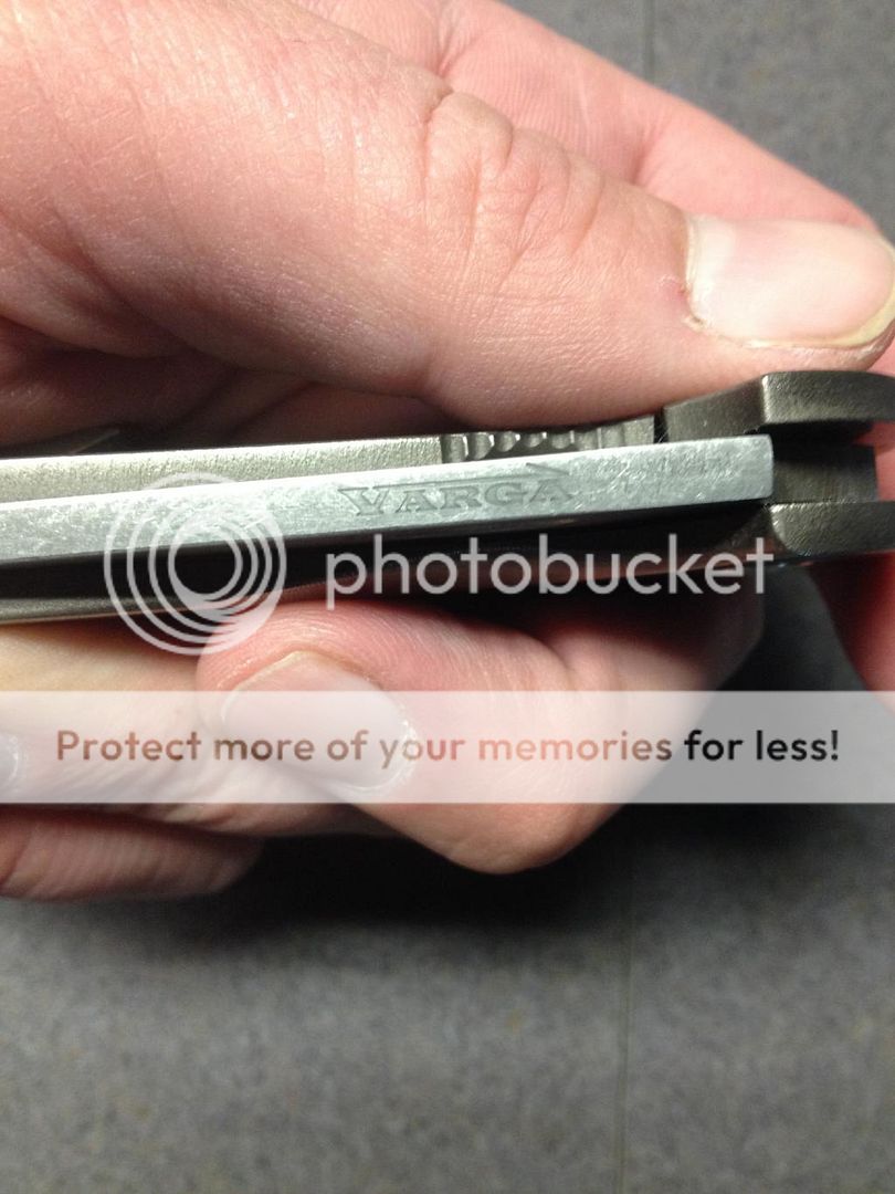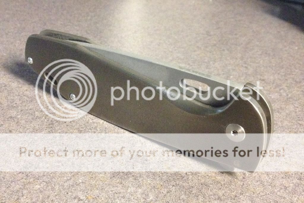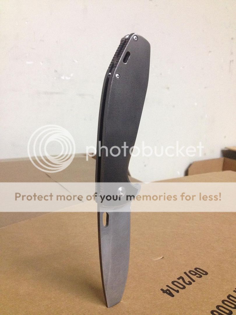 The blade has a very unique acid stonewash finish. It looks great and hides scratches extremely well. They just seem to blend in. The grind thins out gradually down to a very sharp edge. The blade is thick enough to inspire confidence in almost any task, but the edge is plenty thin and fantastically "slicey"! The flipper works very well, and with the bearing setup it flies open like butter! Mark told me he purposely kept the flipper on the smaller side so it wouldn't be obtrusive. I like the idea, and it works. It doesn't stick way out of the frame, but there's more than enough there to flip the blade open. There is also plenty enough flipper to function as a nice guard to keep your fingers from slipping up the blade.