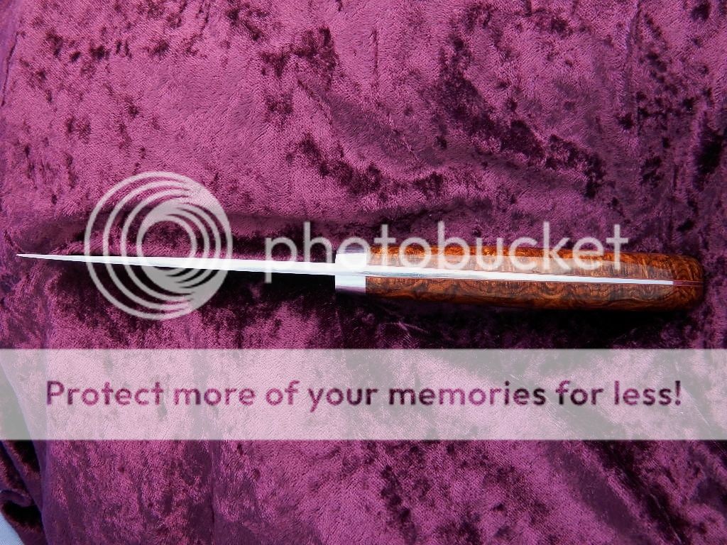4 1/4" VG10 San Mai blade .159 thick and has a semi satin finish.