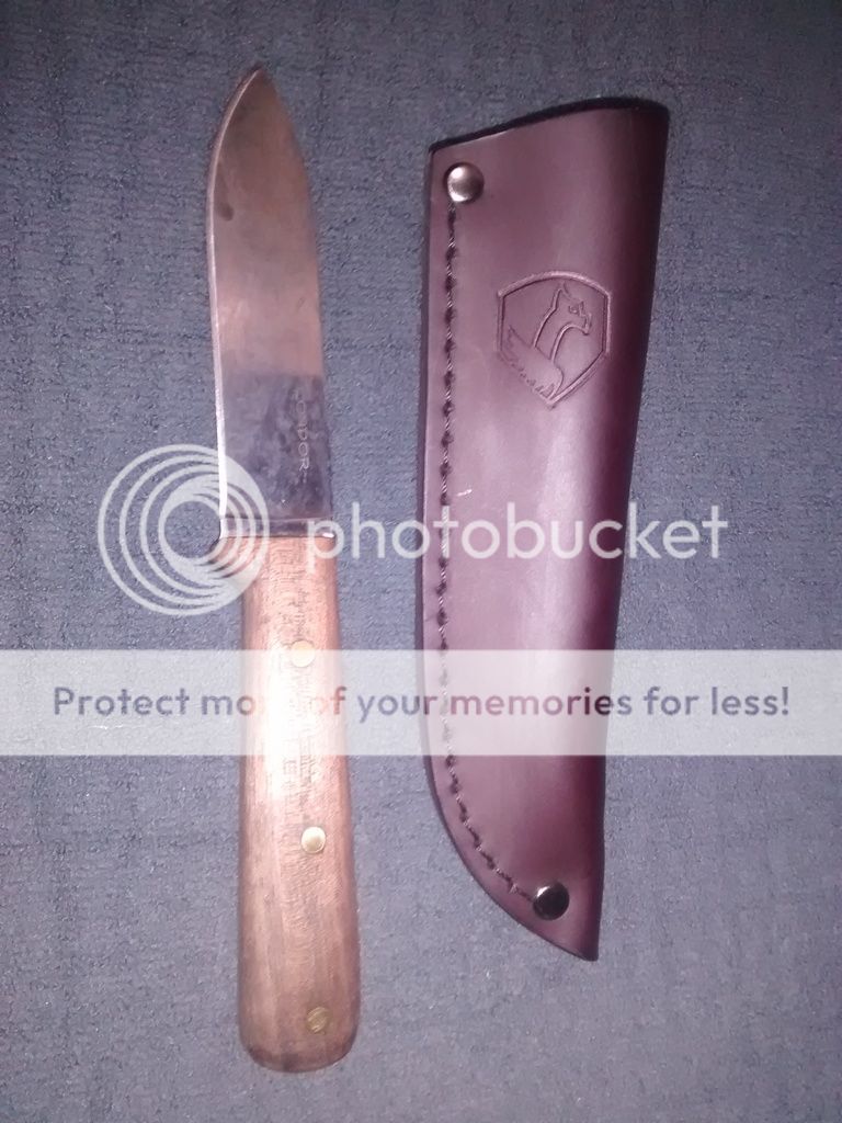 Plus- Condor Kephart- User, blade stripped and natural food patina, edge has been "evened" out, leather sheath in great shape.
