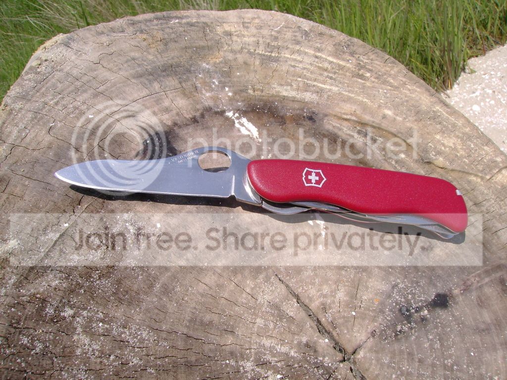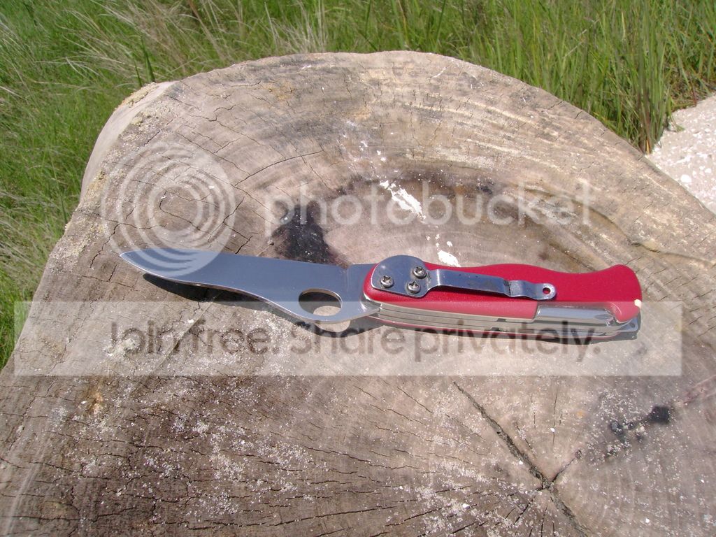 Started with my One Hand Trekker non serrated, and ground it to be a little "pointier". Then swapped the black scales for red and added one of the pocket clips from Swissbianco (stripped of black finish). I thought this would be less threatening in polite company than my previous EDC (Benchmade Griptilian). If Victorinox would offer them this way (and maybe with scissors and a nail file instead of the saw), I bet they would sell a bunch.