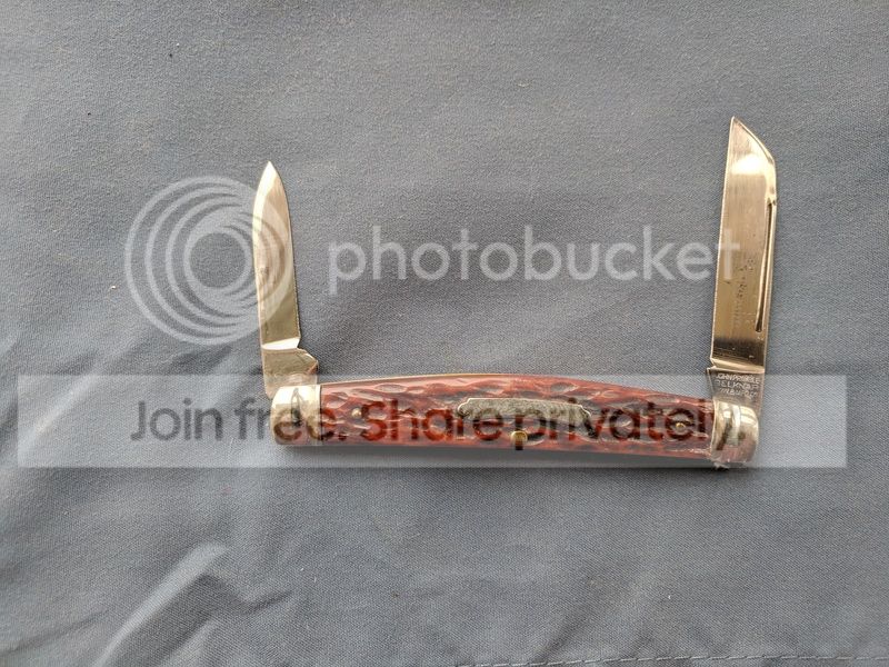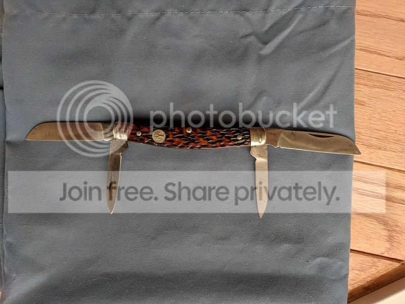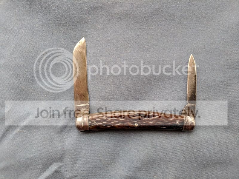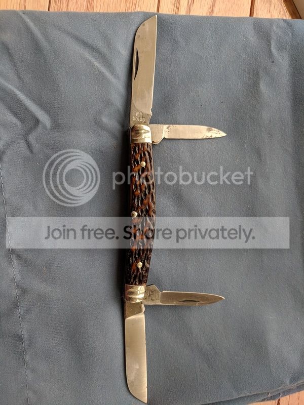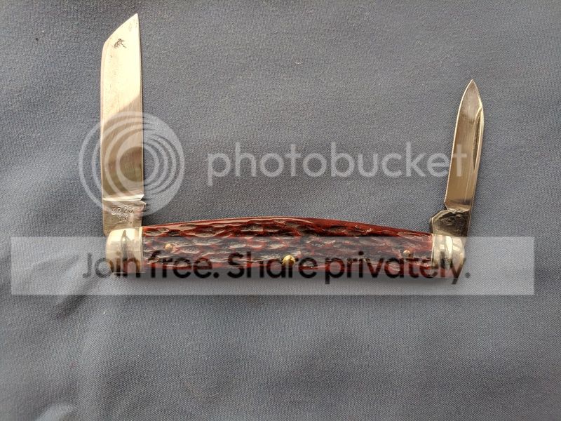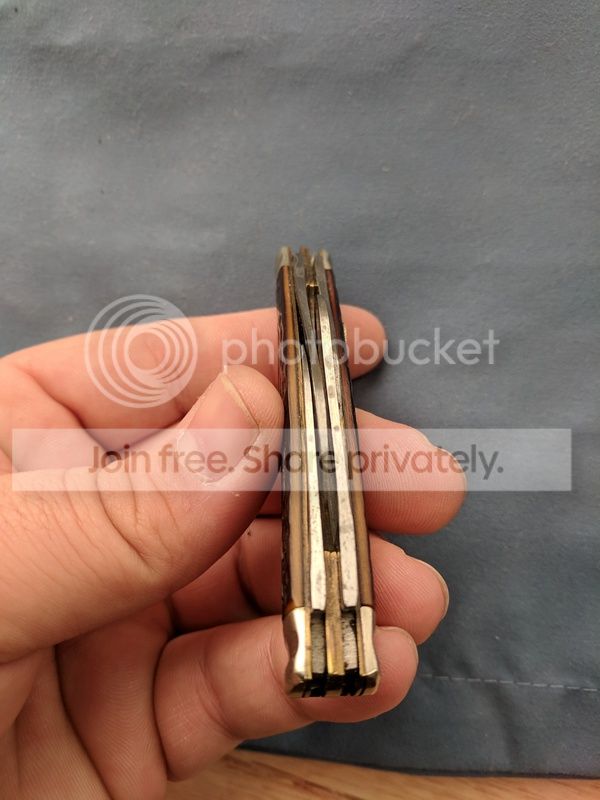 Boker Congress, carbon steel blades. Looks more like jigged delrin than bone, but I'm not sure on that. Has some stains from improper storage over the years. All the blades have good W&T. $50 shipped NOW $40