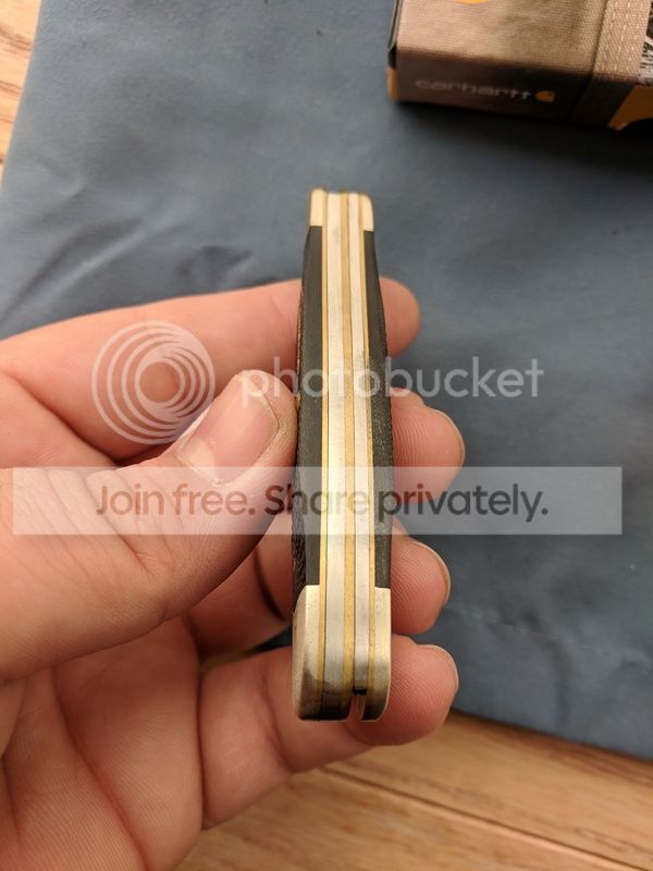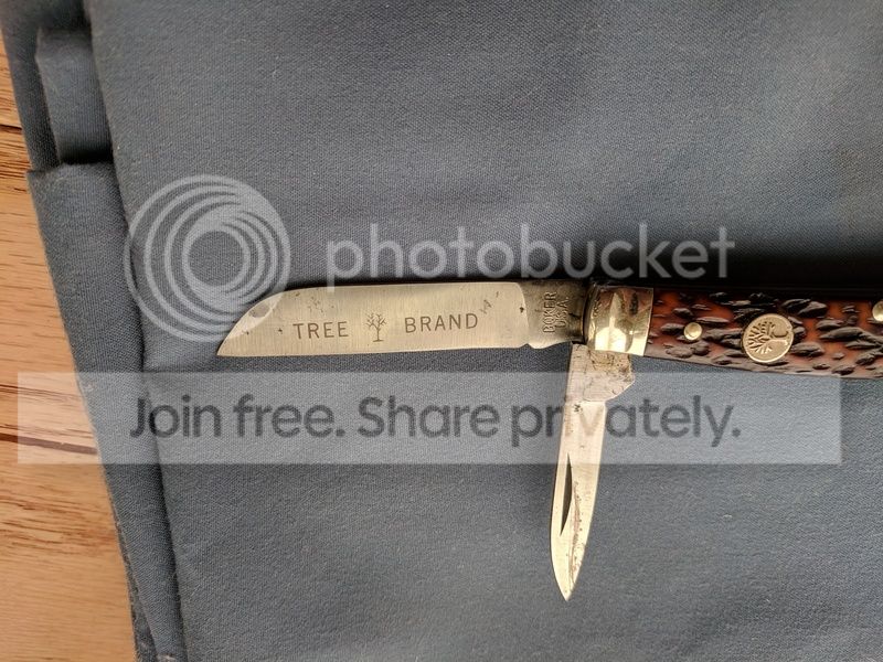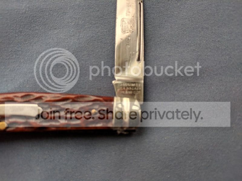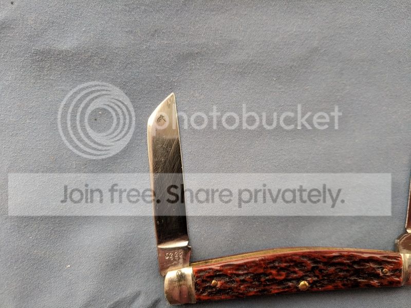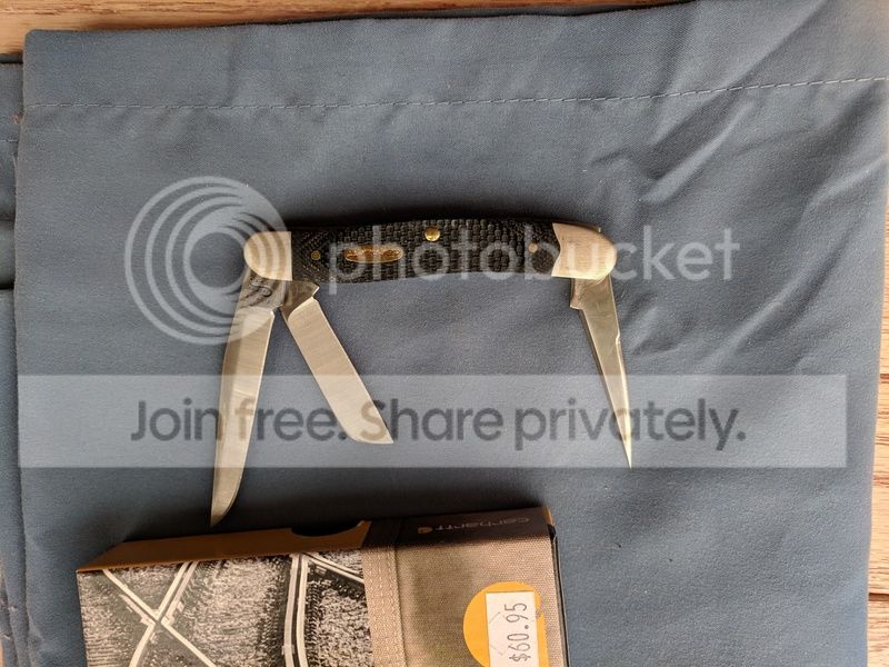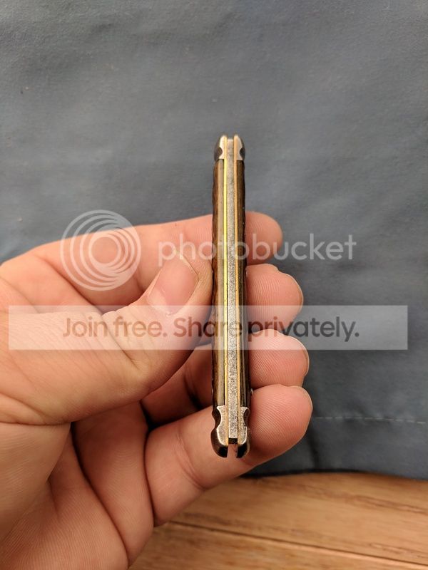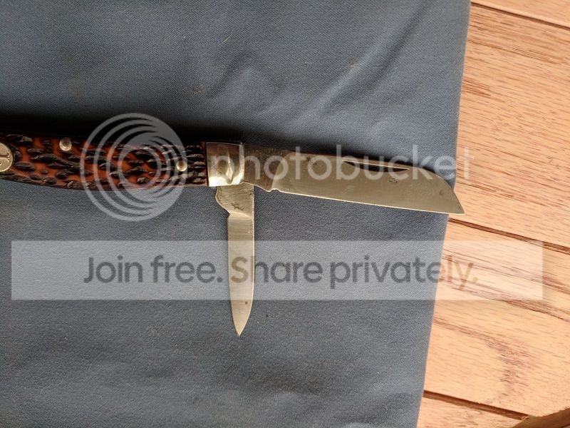 Boker Congress, carbon steel blades. Looks more like jigged delrin than bone, but I'm not sure on that. Has some stains from improper storage over the years. All the blades have good W&T. $50 shipped NOW $40