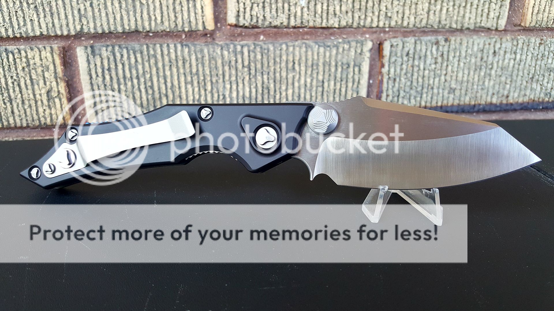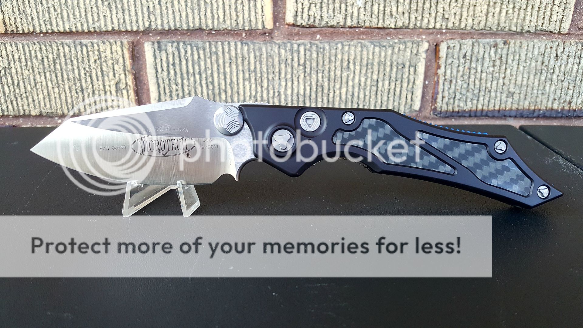 This knife won "Most Innovative American Design" at 2011 Blade Show. Condition is just about the same as the day it left Microtech. Never used, carried or sharpened. It has been handled a limited number of times. Deploys flawlessly in both automatic and manual mode. Blade is perfectly centered. No play in any direction. There is some lock stick. However, this knife is not broken in whatsoever. No nick, chips or rolls on original unused MT factory edge. The handles are in perfect condition. Every proprietary MT screw is in perfect condition as is the pocket clip. No dings, dents or any other imperfections that I can see anywhere on knife. Comes with inner box, outer sleeve, operating instructions, blank registration/warranty card, MT sheath, key to lock out auto mode, baggie for knife, baggie for key. In other words, it comes with everything same as new.