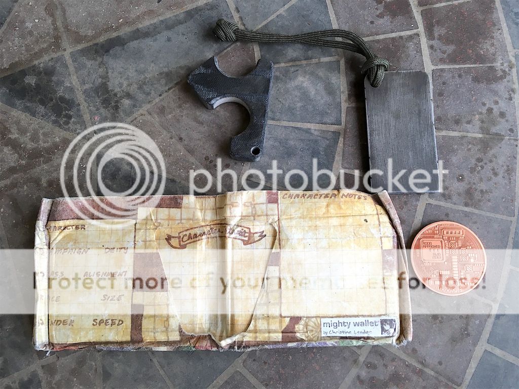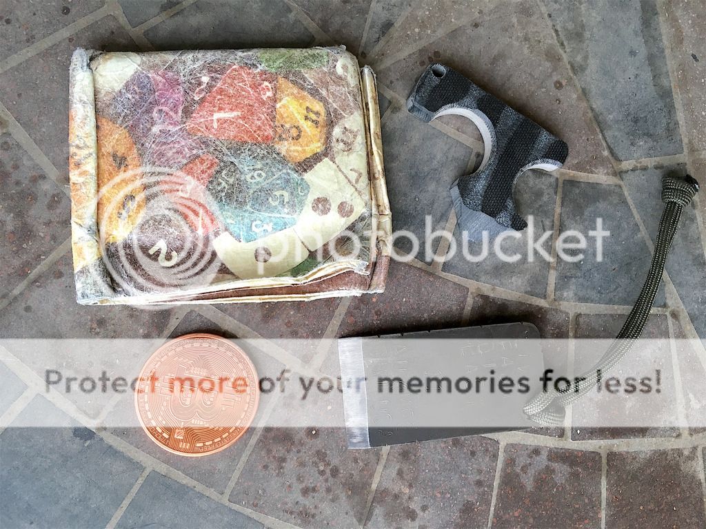 Well-worn Tyvek Mighty Wallet with a D&D / Dice theme, a (no currency value) Bitcoin, a knuck made out of some variety of fiberglass reinforced plastic, and a wedge thing with LIVE FAST DIE LAST inscribed into it. The knuck and wedge were surprise additional items that came with a knife purchase and dont really fit my lifestyle at all. The wallet was carried for the better part of two years and it shows. The Bitcoin is supposed to be solid Copper, but Im pretty sure its not as no patina has shown up on it after weeks of carry and even an attempted vinegar bath forced patina. Its just a big ol pile of pockety stuff!