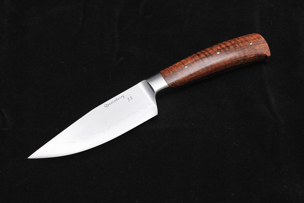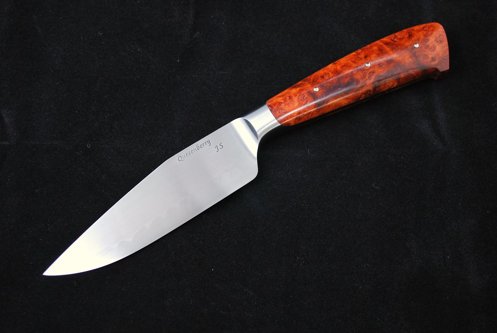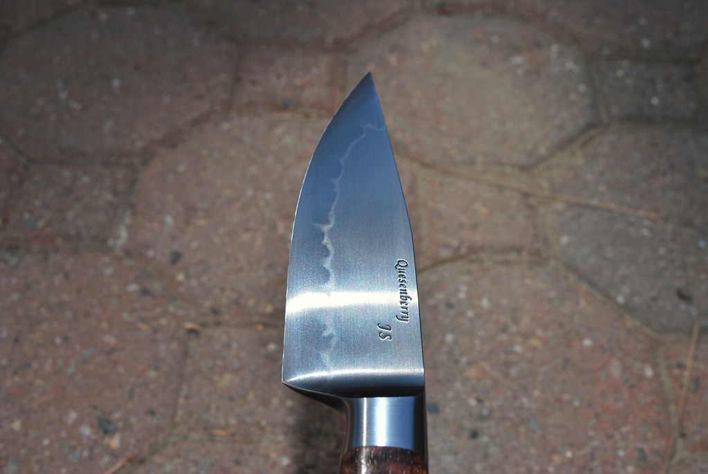 These are a couple W-2 integrals I finished up recently. Both are forged from Aldo's W-2 and finished with a 1200 grit finish and domed ns pins. The Amboyna handled knife is currently being fitted with Paul Long leather at the customers request. The Koa knife's tang got reshaped just a bit due to some weld that was left over from the handle being tacked on:barf:. I think it was a good save though. Hope you like em'.