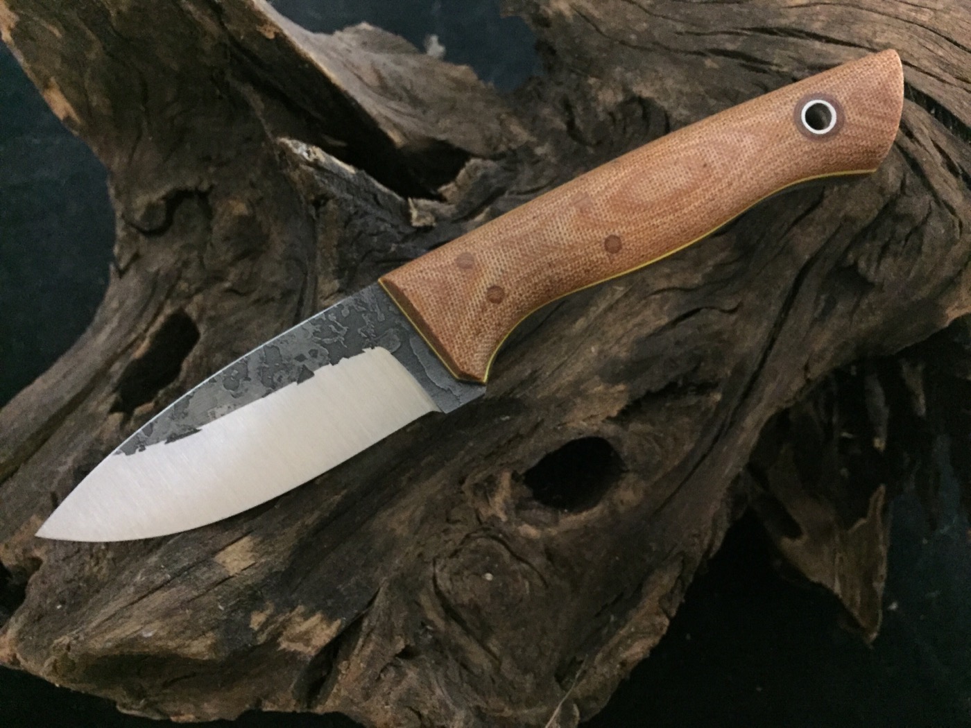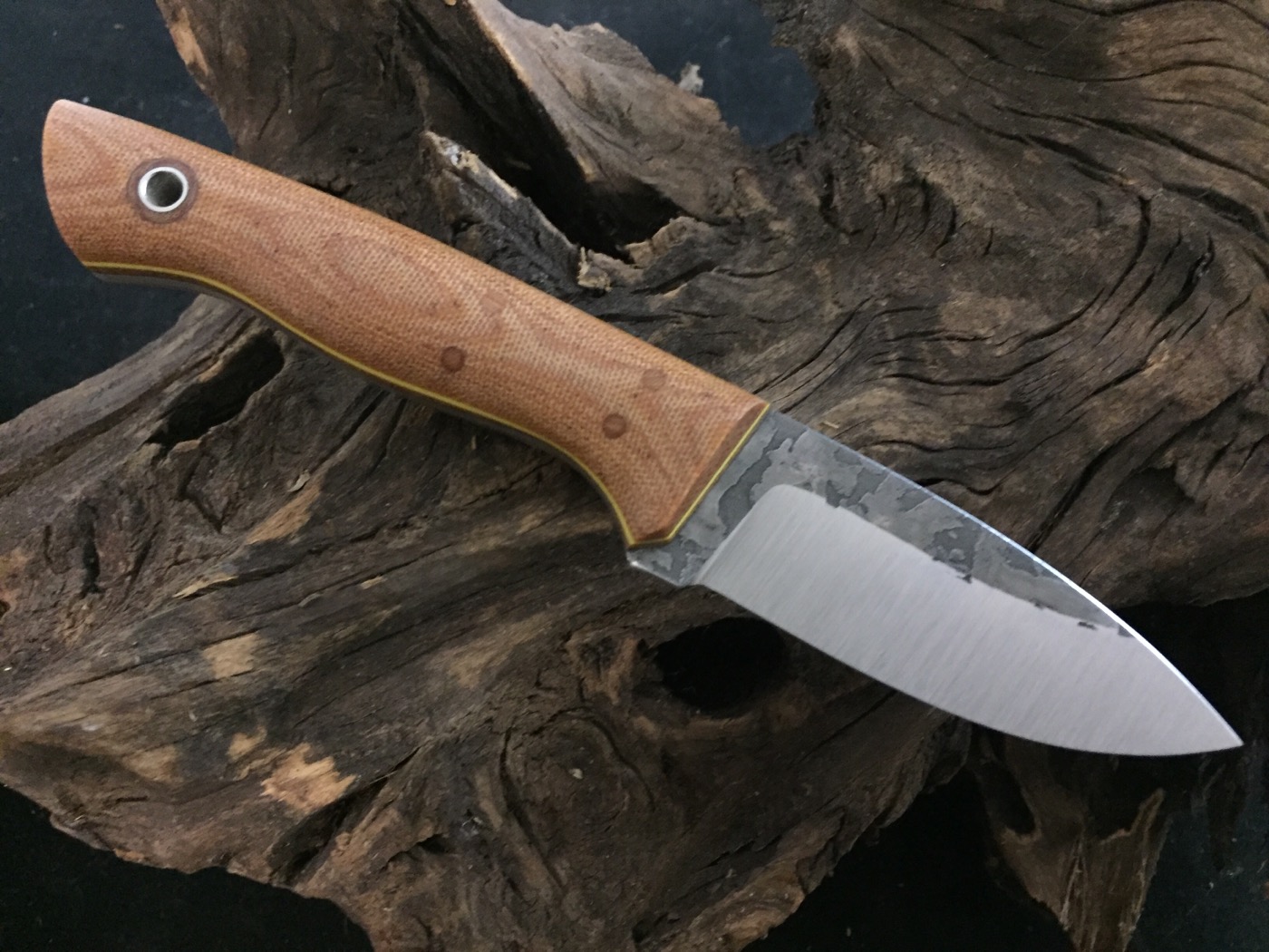 Brisbee with osage over natural liners and white pinstripes flat ground on 1/8 A2 tapered tang $330