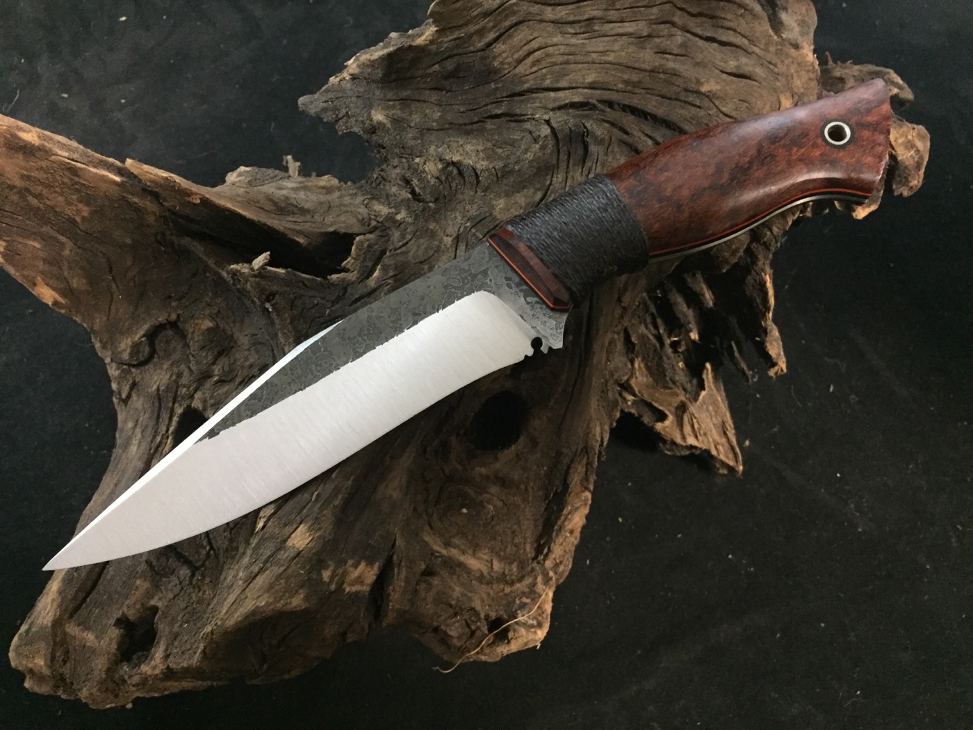Hosted on FotkiRevenant with figured sapele over black liners with orange pinstripe flat ground on 5/32 A2 tapered tang hemp wrap. $380