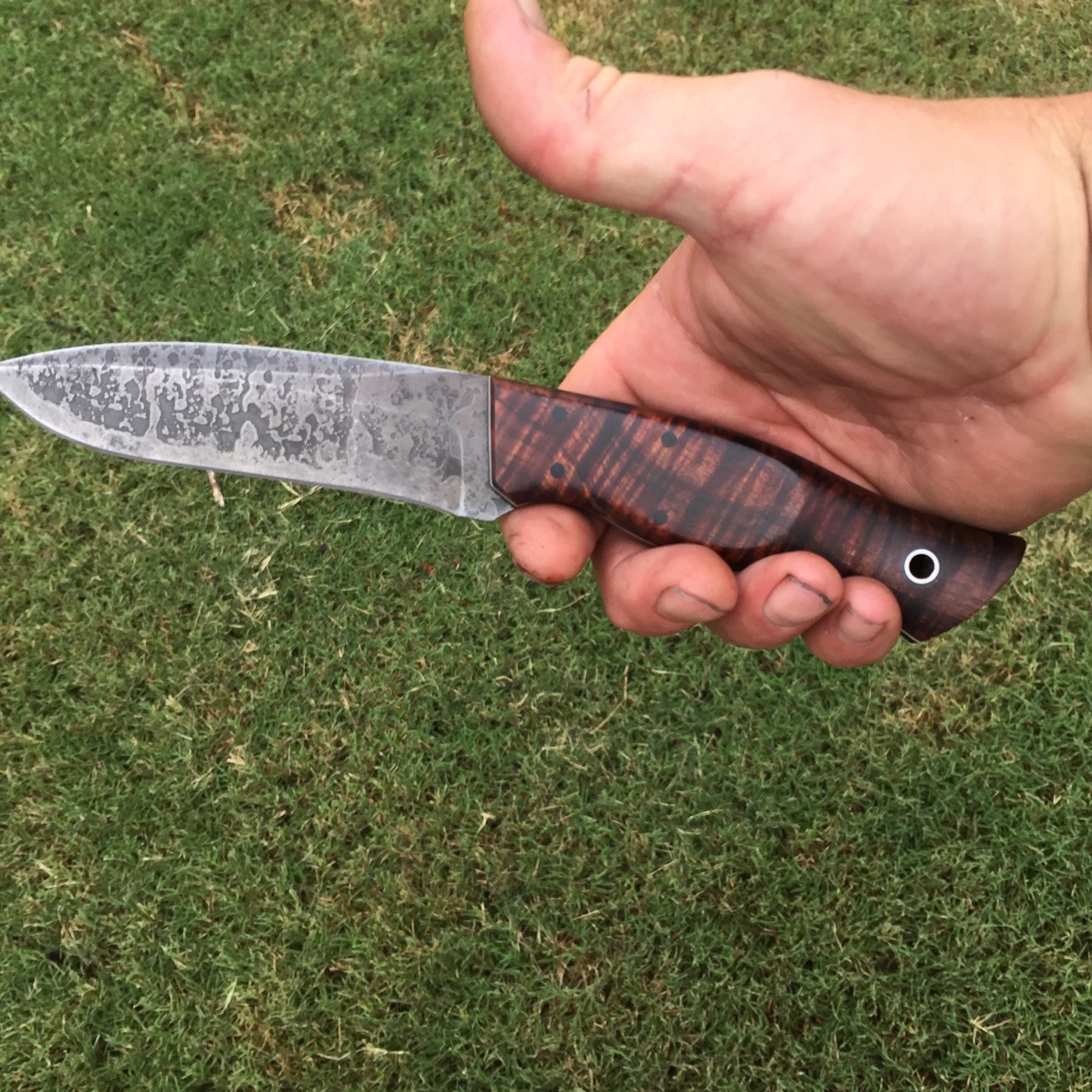 Hosted on FotkiEpic Raven with curly Koa over black liners with white pinstripes flat ground on 1/8" A2 tapered tang Swedge and full 3D Spalting. $365