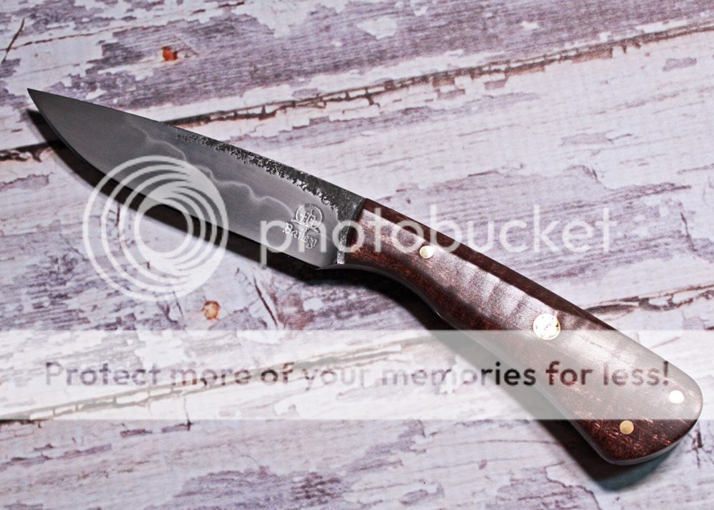The handle comes from a stock of scales that I had purchased and just found at the back of a drawer. It is stabilized and dyed curly maple. I secured it to the tang with pins and G-flex epoxy.