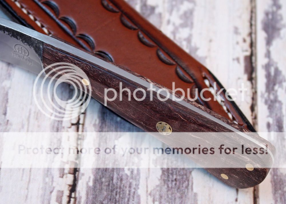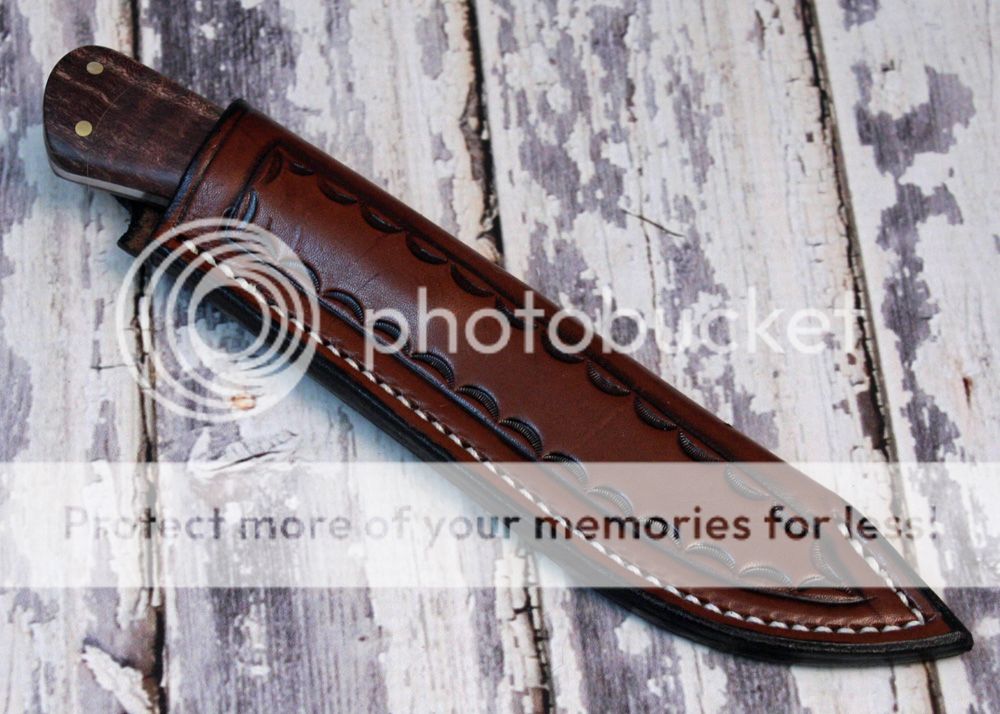The sheath is 5-6oz hand tooled leather from Wickett and Craig. the knife slides in and out easily, but can be turned upside down without loosening it's grip on the knife.