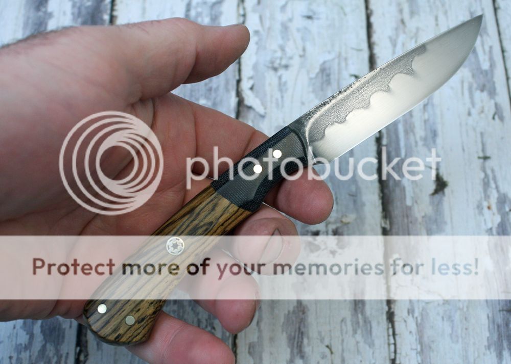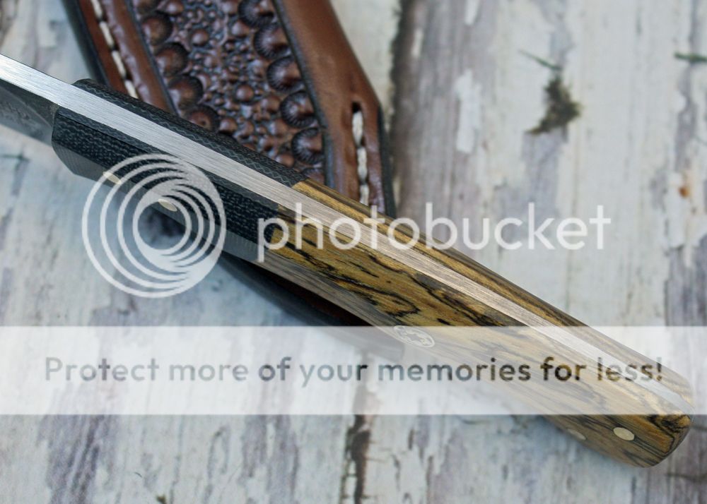 The handle is Bocote with black canvas micarta. The handle has been shaped and sculpted to fit the hand well. It is held in place with pins and G-flex epoxy.