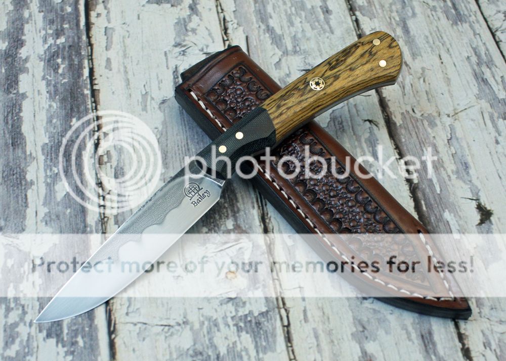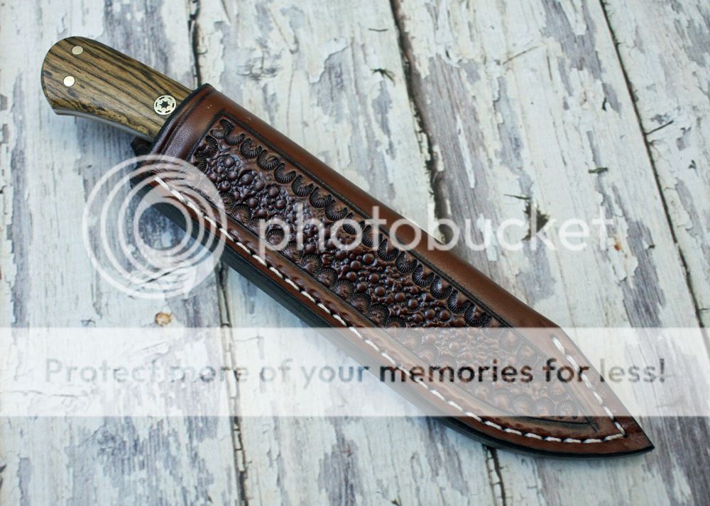 The sheath is 7-8oz hand tooled leather from Wickett and Craig. It fits well and draws easily.