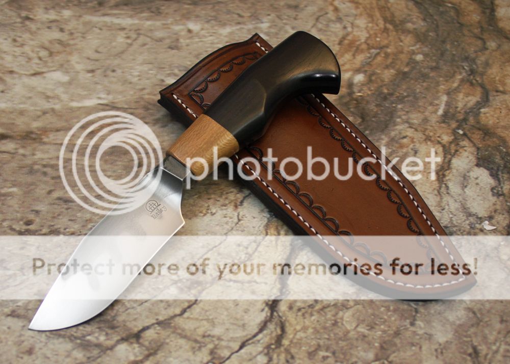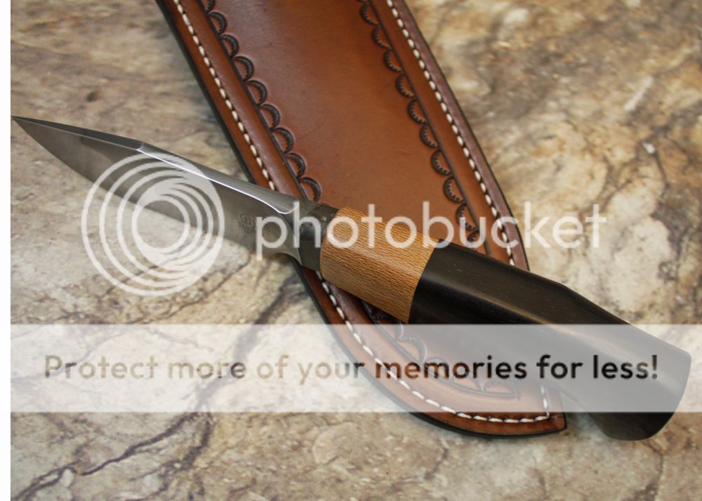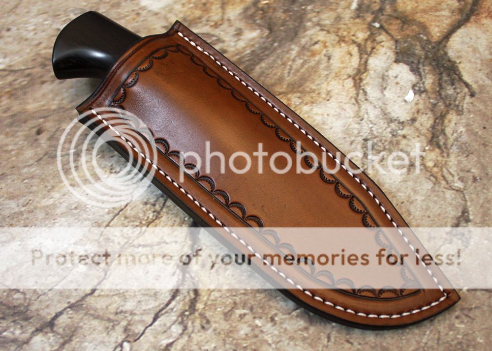 The sheath is 7-8oz hand tooled leather from Wickett and Craig. It holds the knife snugly and draws well.