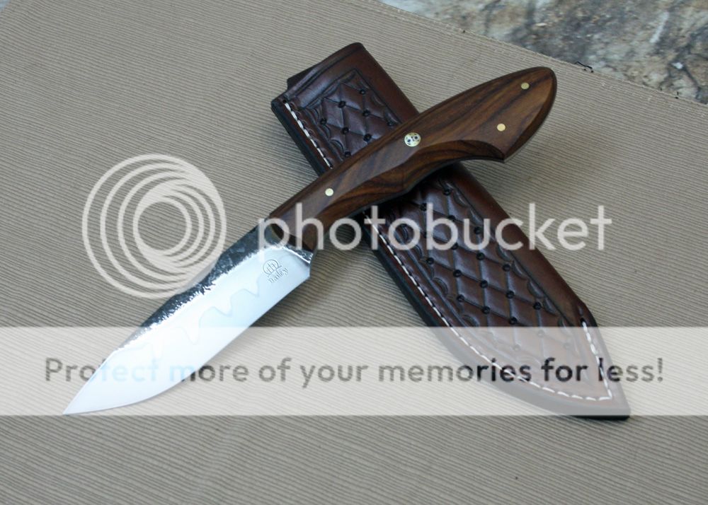 The sheath is 7-8oz hand tooled leather from Wickett and Craig. The knife draws easily and yet holds securely.