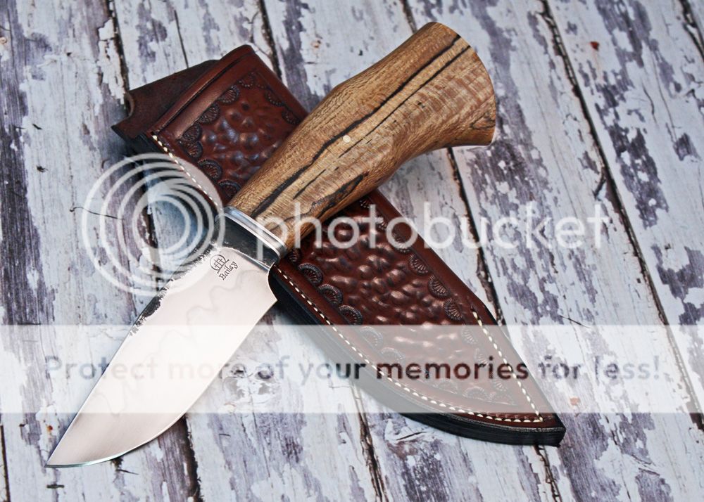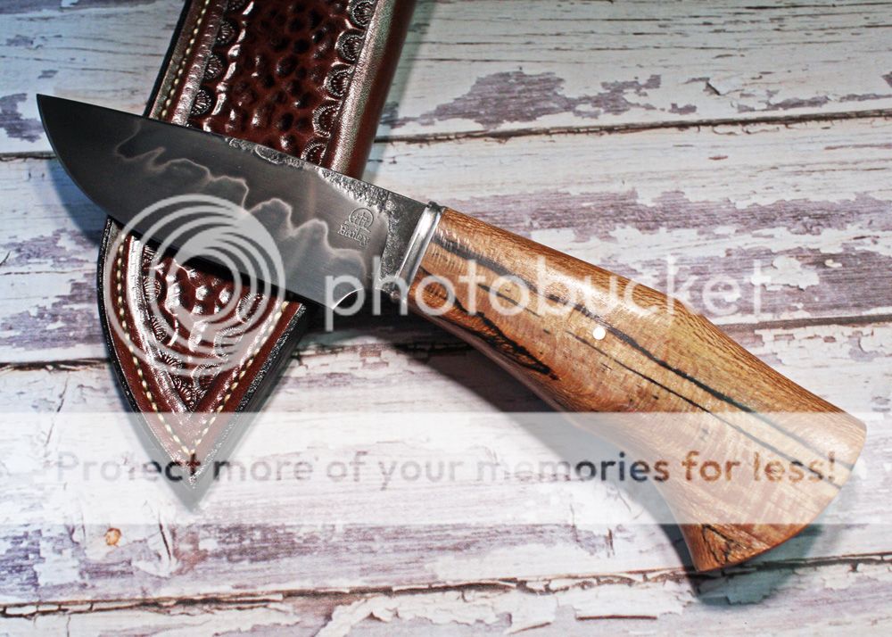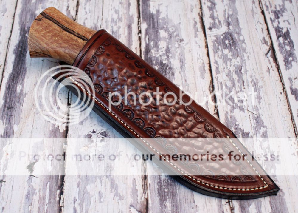 The sheath is hand tooled leather from Wickett and Craig. The knife fits in well and draws easily.
