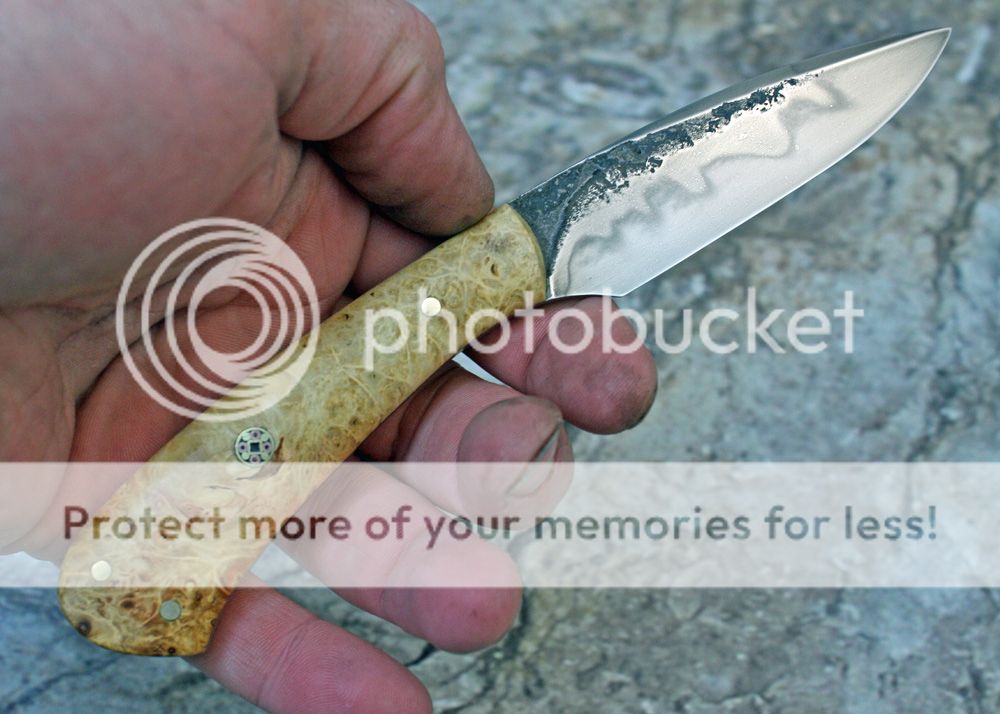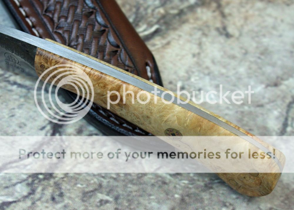 The handle is stabilized box elder burl. I cant remember where I got it, because it has been in a drawer for several years. It is sanded and shaped to fit in the hand well. The scales are held in place with pins and G-flex epoxy.
