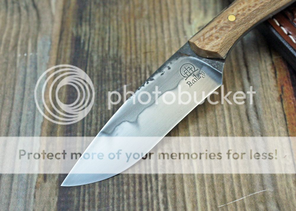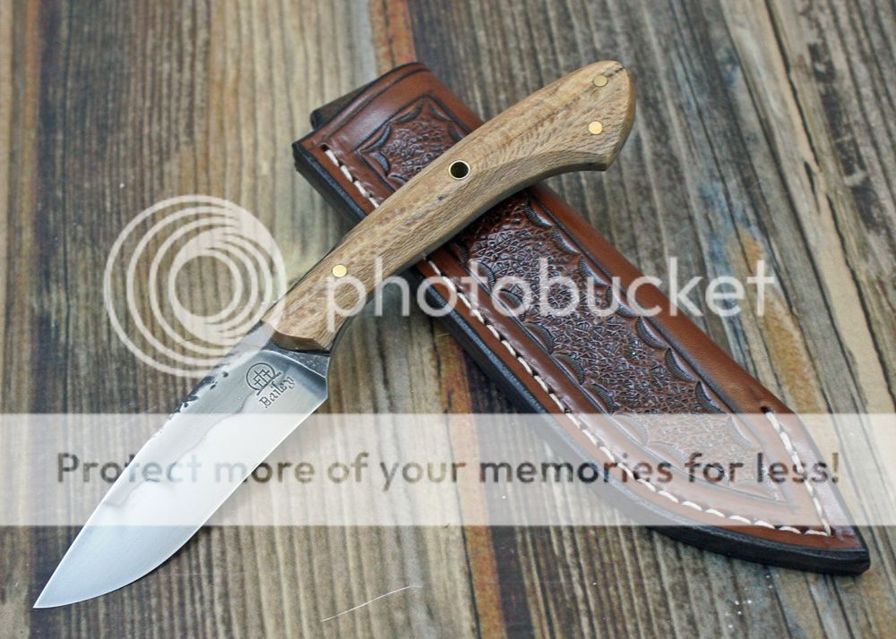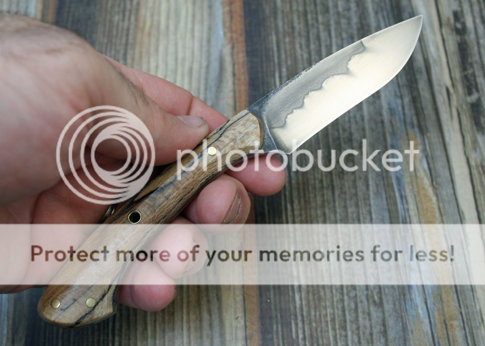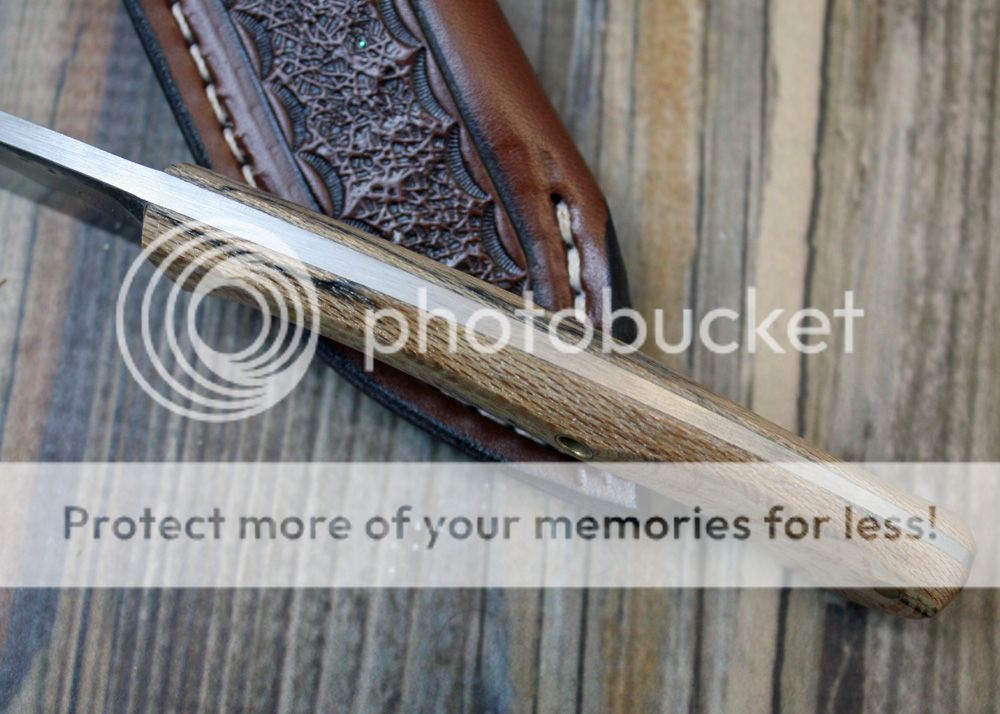 The handle is stabilized sycamore. I had the knife blade finished and my wife walked into the shop. I let her pick the handle material, and I really like the result. It is held in place with pins and G-flex epoxy.