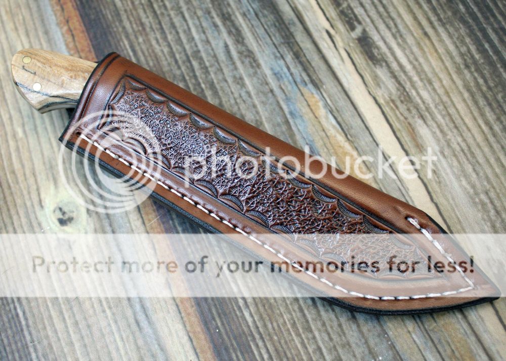 The sheath is 7-8oz hand tooled leather from Wickett and Craig. It holds the knife securely. It is very durable and will last as long as the knife. (which should be several generations)