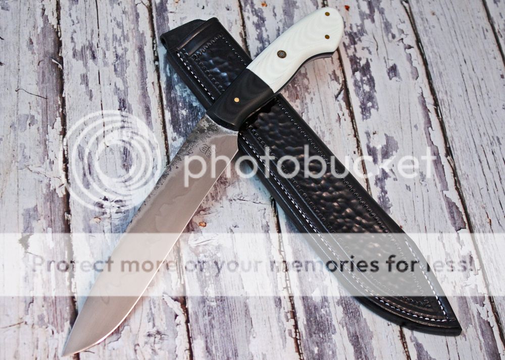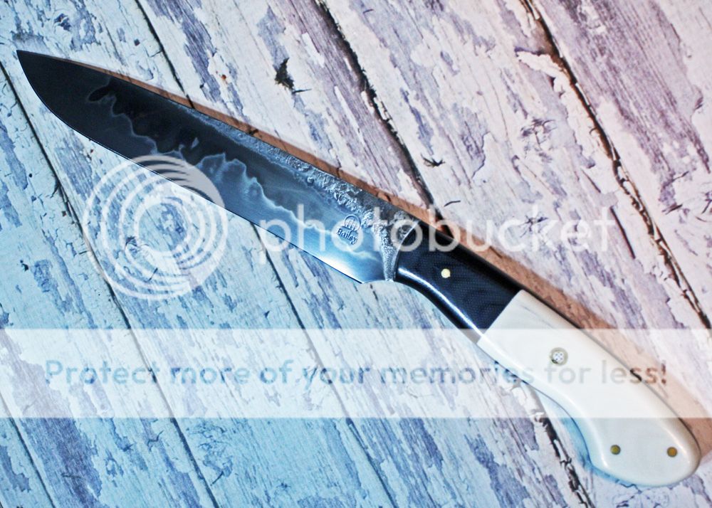 The handle is black micarta and white G-10. I milled the micarta and fit the g-10 in the recess, so the liner and bolster is actually one piece. It is shaped and sculpted to fit in the hand comfortably. It is held in place with pins and G-flex epoxy.