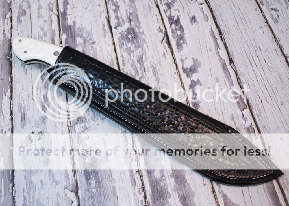 The sheath is 7-8oz hand tooled leather from Wickett and Craig. The knife fits well and draws easily.