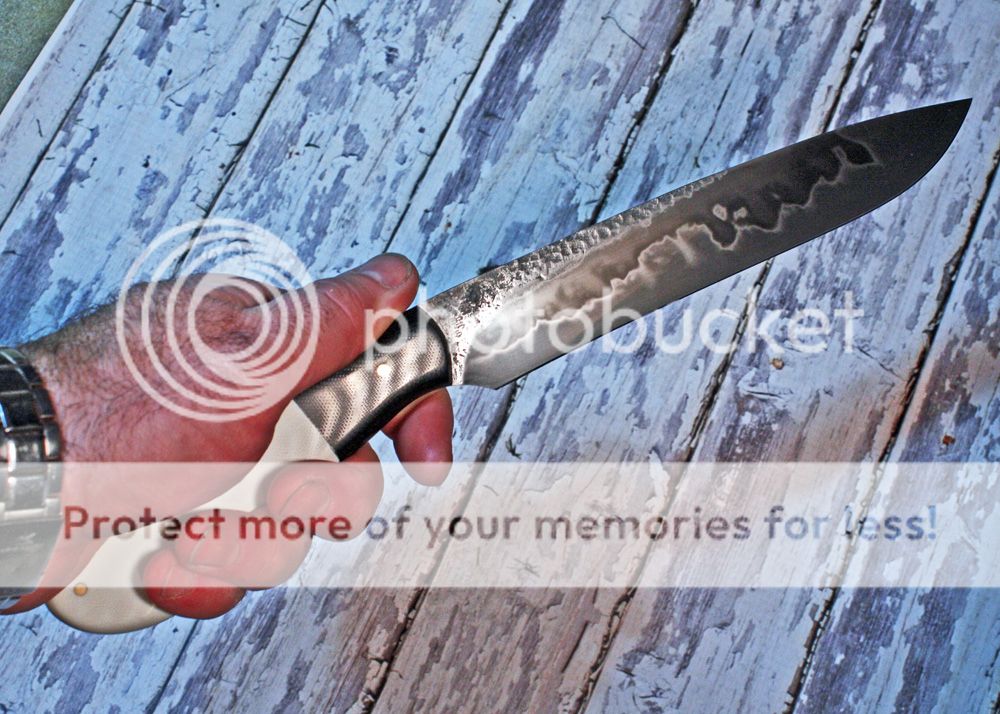 This is some of Hanson's W2. I forged it into this camper kind of knife. I don't want to toot my own horn, but this is one of the best hamons I have put on a knife. It is really bold and has nice activity.