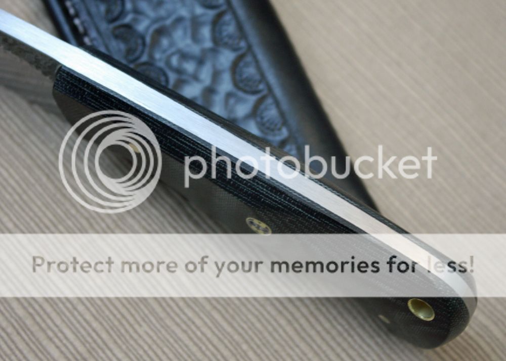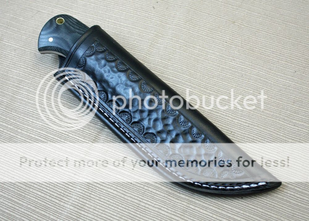 The sheath is 7-8oz hand tooled leather from Wickett and Craig. It is dyed black to match the handle. It holds the knife securely and allows for easy draw.