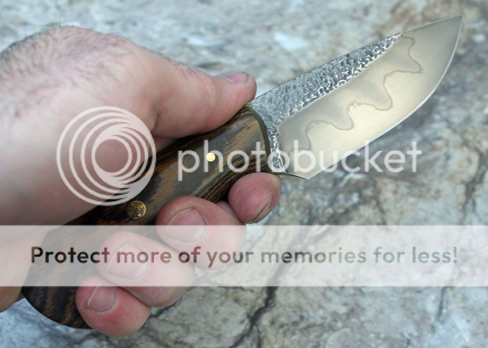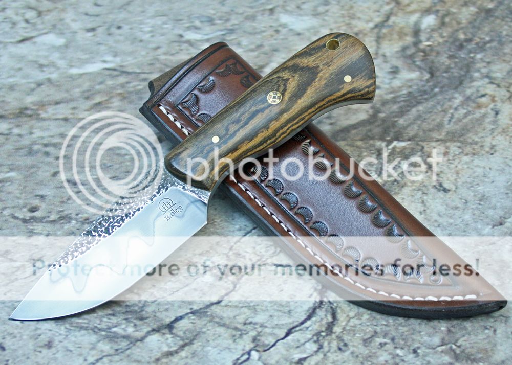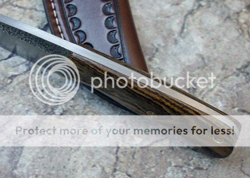 Bocote handle with pins and G-flex epoxy. The handle is sculpted and shaped to fit the hand well. It was sanded to 1000 grit and buffed.
