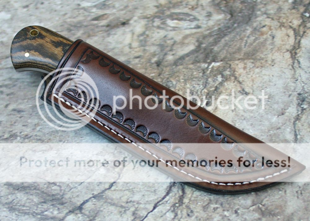 7-8oz leather sheath. Leather from Wickett and Craig. The knife fits well and draws easily.