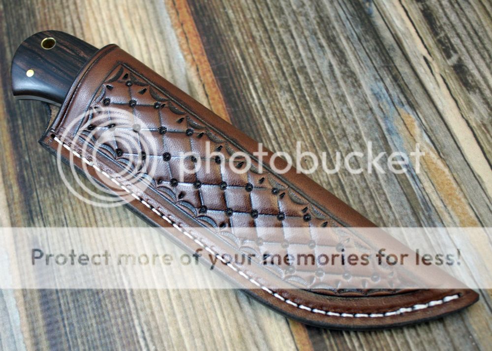 The sheath is 7-8oz hand tooled leather from Wickett and Craig. It is nice and sturdy and holds the knife securely.