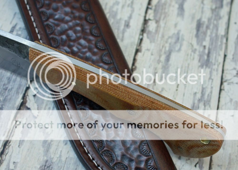 The handle is natural canvas micarta. It is held in place with pins and G-flex epoxy. It has been faceted and it feels nice in the hand.