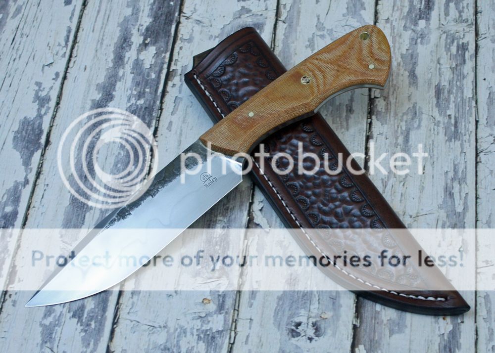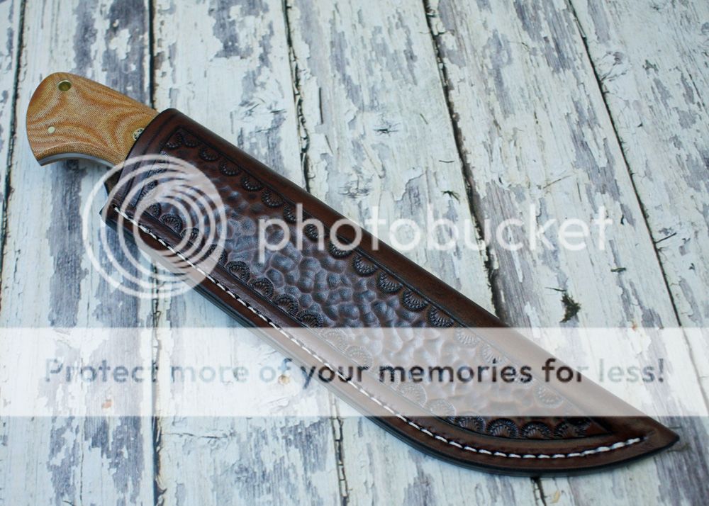 The sheath is 7-8oz hand tooled leather from Wickett and Craig. The knife fits well and draws easily.