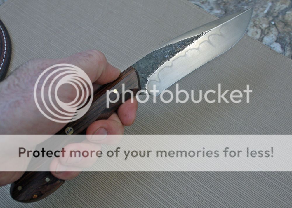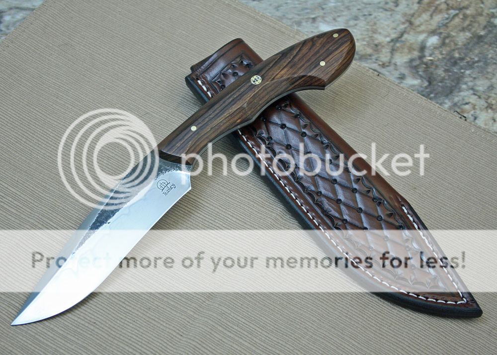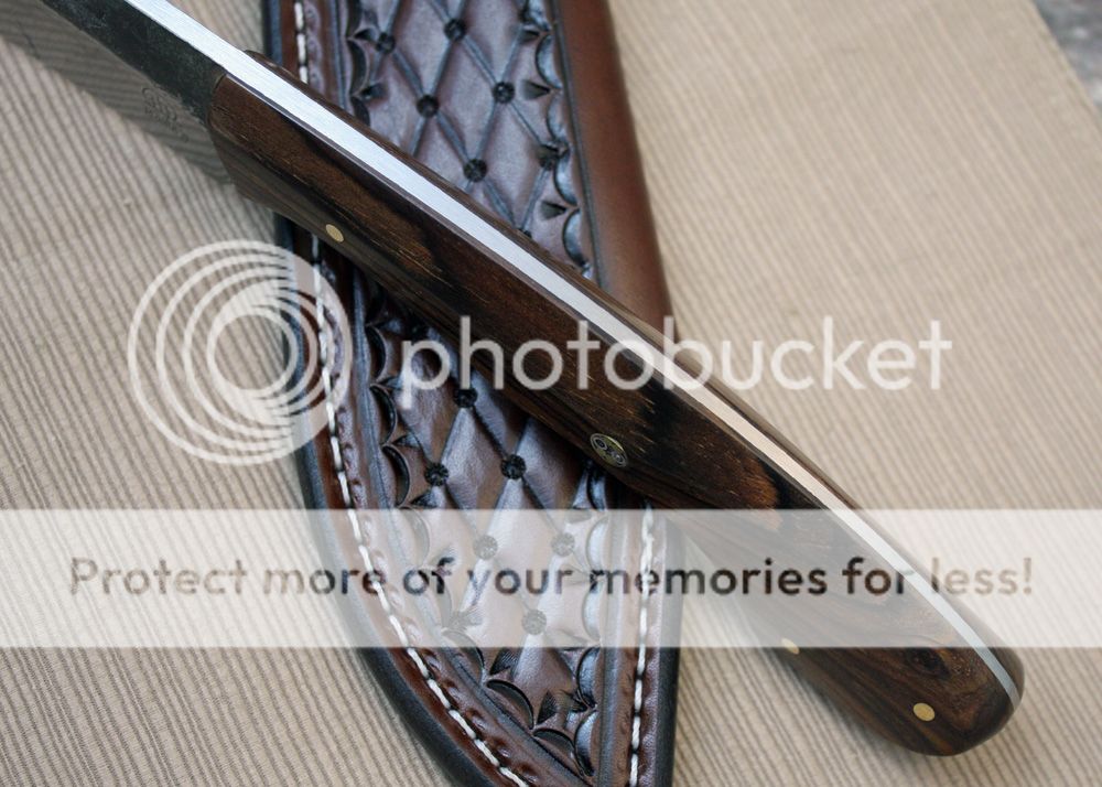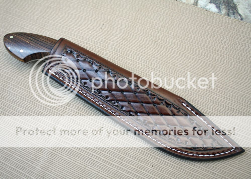 The sheath is 7-8oz hand tooled leather from Wickett and Craig. The knife draws easily and yet holds securely.