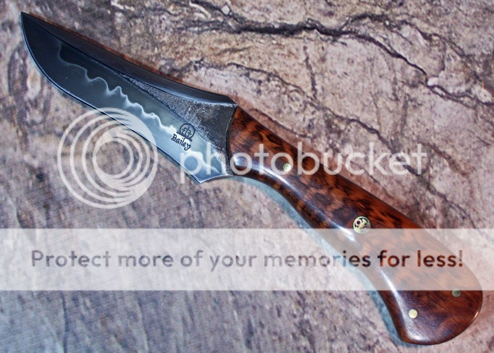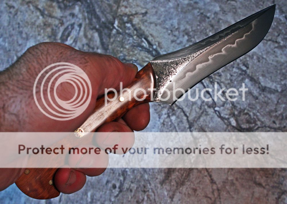I forged this from some of Aldo's W2. The blade is ground on my rotary platen for a slight convex grind. It was hand polished to 1500 grit in order to bring out the details of the hamon. The top edge is sharpened, but not as razor sharp as the cutting edge.