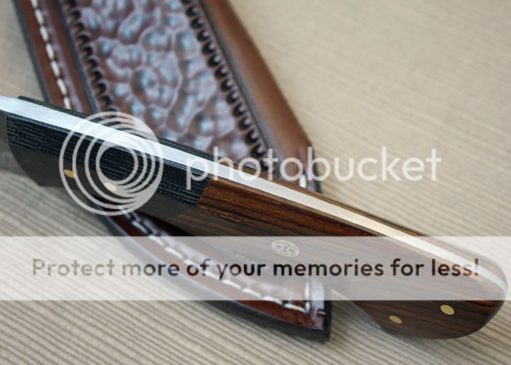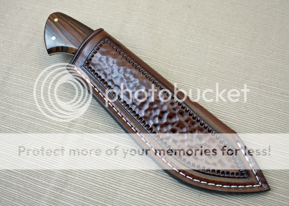The sheath is 7-8oz hand tooled leather from Wickett and Craig. it holds the knife snugly and allows for an easy draw.