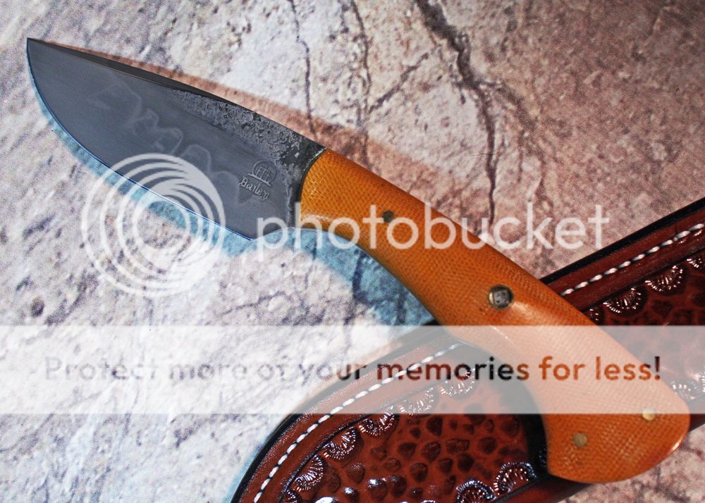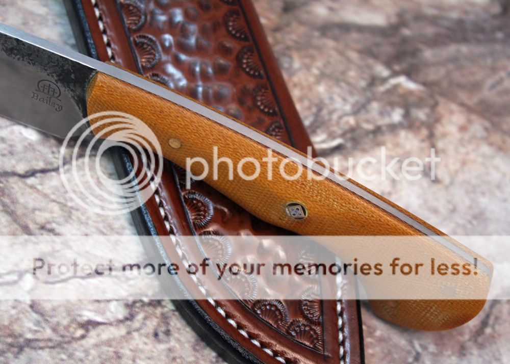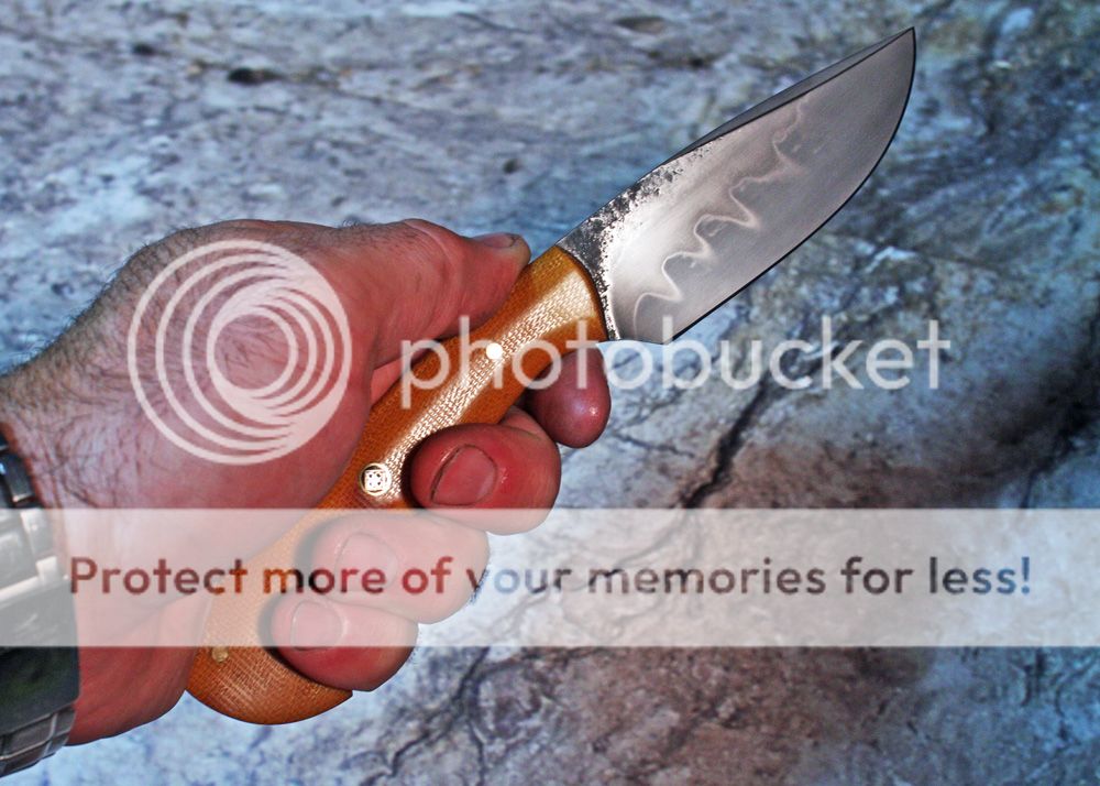The handle is canvas micarta shaped and sculpted to fit the hand well. It is held in place with pins and G-flex epoxy.