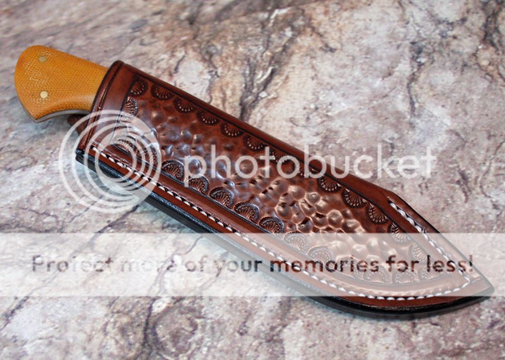 The sheath is 7-8oz hand tooled leather from Wickett and Craig. The knife fits snugly and draws well.