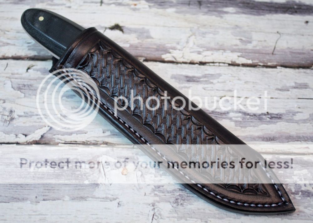 The sheath is 7-8oz hand tooled leather from Wickett and Craig. The knife fits snugly and comes out easily.