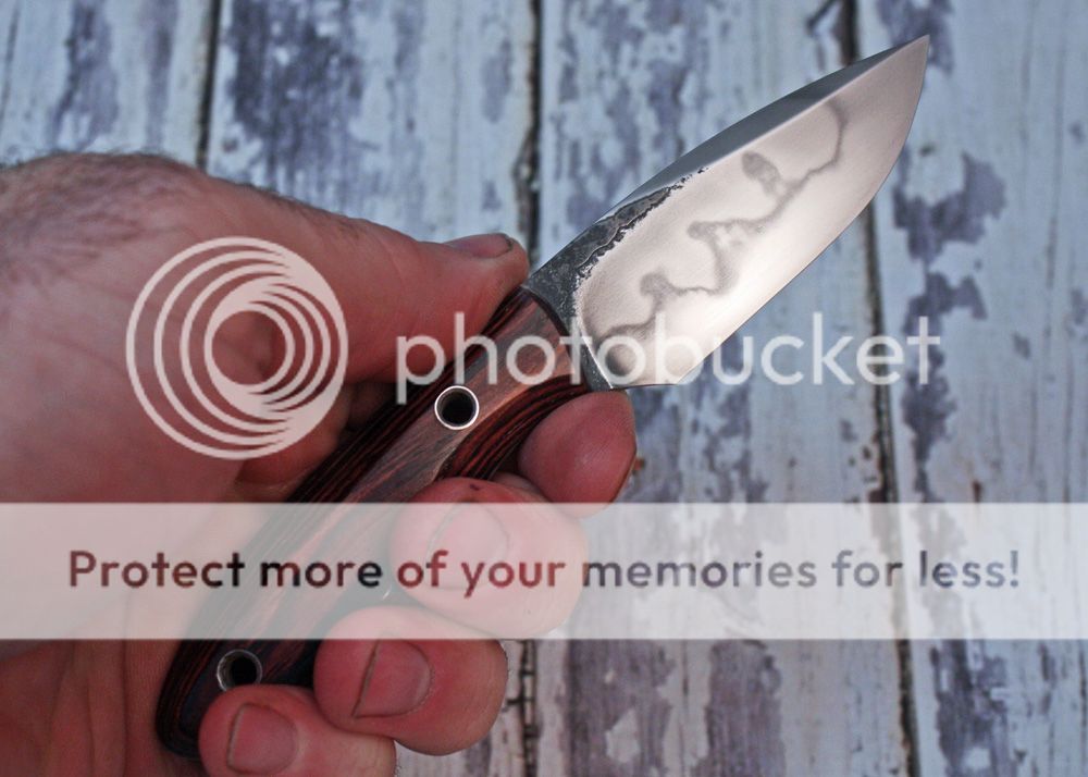 This is some of Hanson's W2, forged into a nice pocket fixed blade. The blade has been clay quenched and polished then etched to bring out the nice hamon.