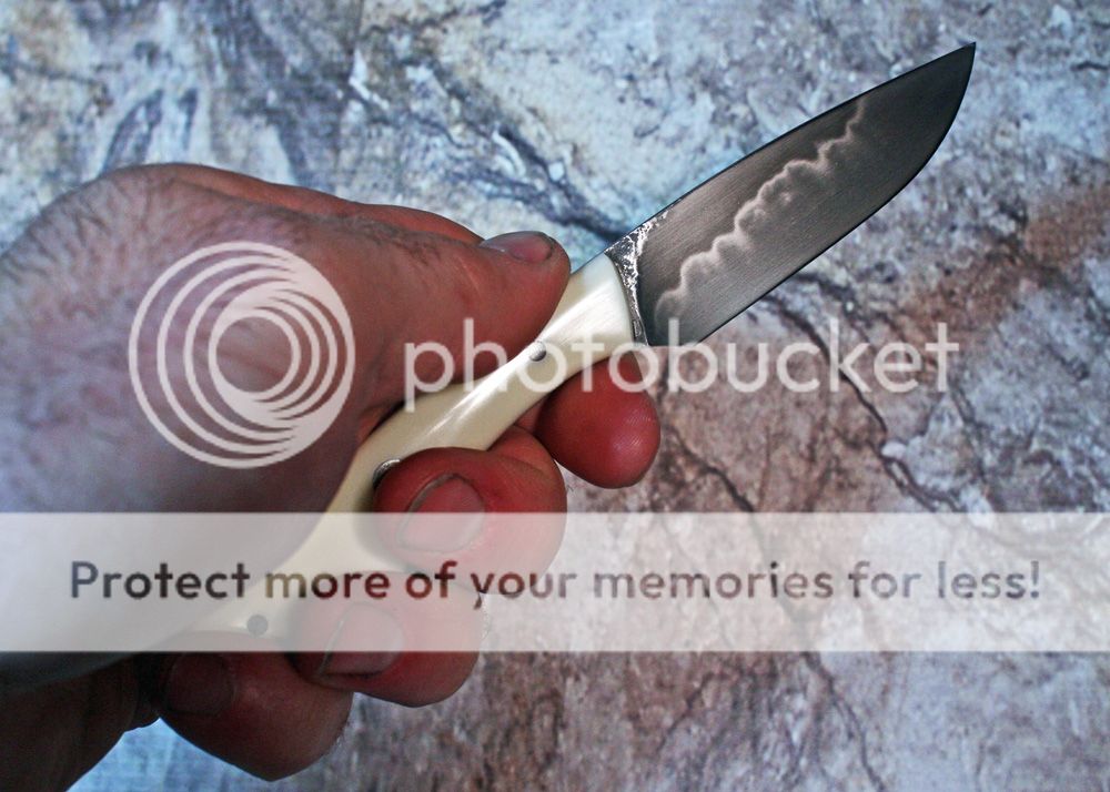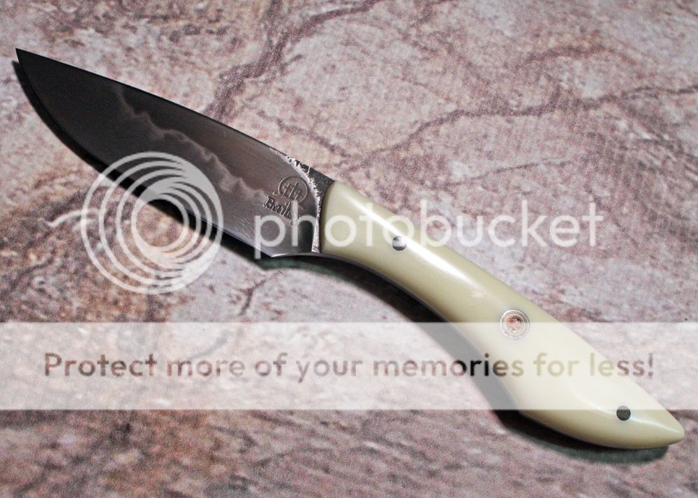 The handle is ivory micarta and is held in place with micarta pins and one mosaic. It is polished and shaped and really fits the hand well.